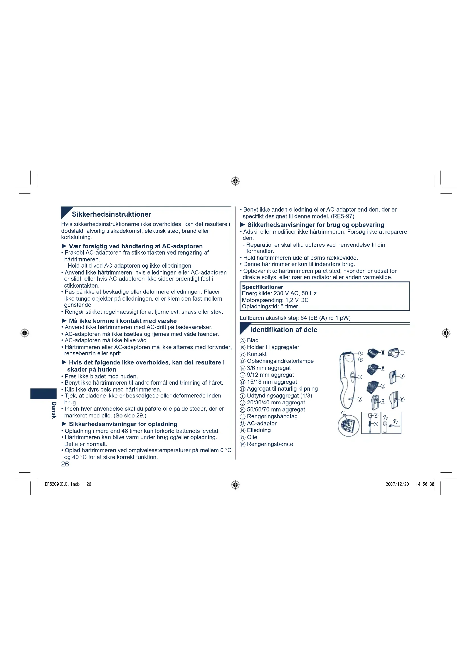 - Benyt ikke trimmeren i omvendt position. Dette kan klippe håret for kort. 1Trimningudenaggregatpåsat Klipning af håret uden aggregat påsat vil trimme håret til en længde på 1 mm eller mindre. 1.Kliphåretvedatplaceretrimmerhovedet direktepåissen. 1AC-drift Hvis du tilslutter AC-adaptoren til hårtrimmeren på samme måde somvedopladningogindstillerkontaktenpå“1”,kanduanvendetrimmeren, selvom batterikapaciteten er lav.• Hvis trimmeren ikke virker, skal du indstille kontakten på “0•charge”,venteca.1minutogderefterindstilledenpå“1”igen.•Paspå,atduikkeaaderbatterietheltmedkontaktenindstilletpå“1”.Detteresultererikorterelevetidforbatteriet. ER5209(EU).indb 28 2007/12/20 14:56:40Dansk