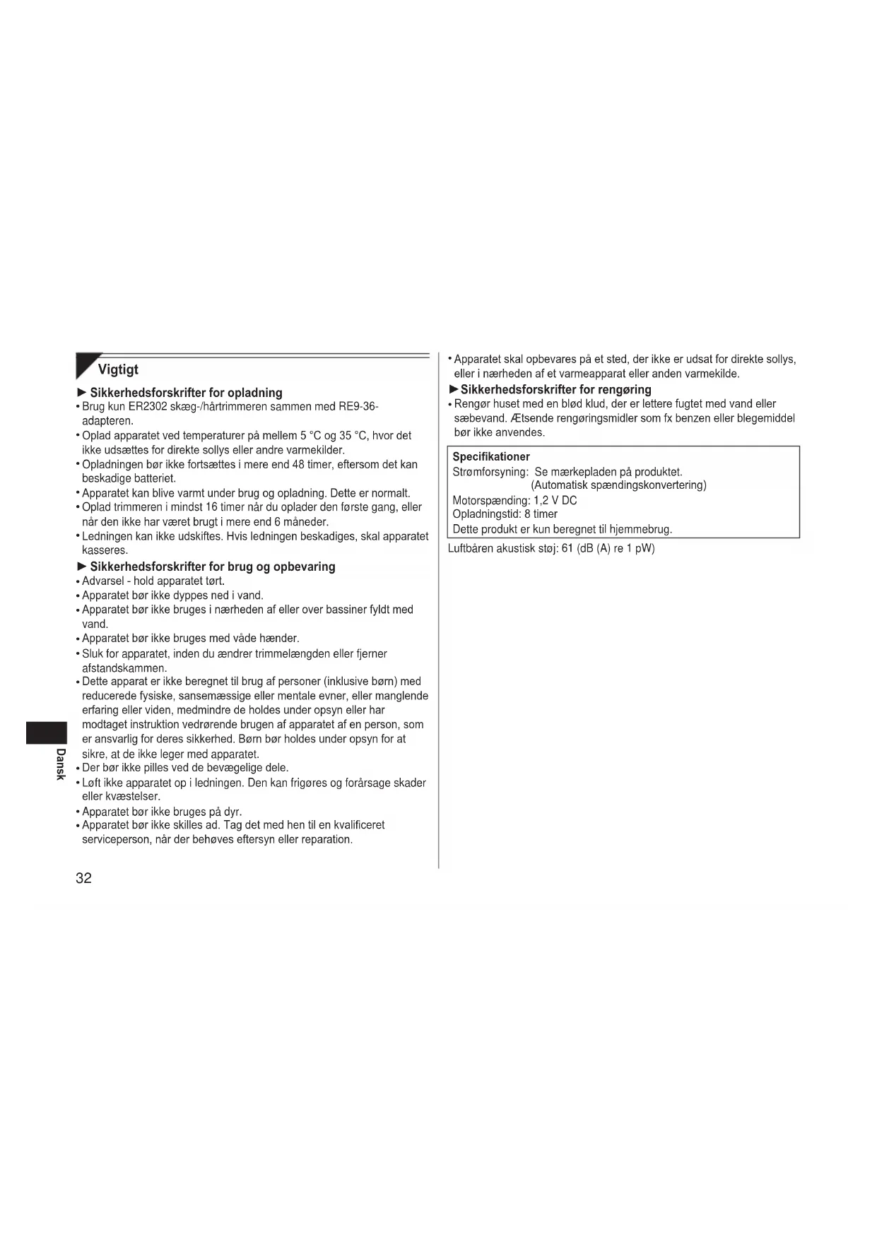 Apparatet kan blive varmt under brug og opladning. Dette er normalt. - Oplad trimmeren i mindst 16 timer nar du oplader den forste gang, ellner den ikke har vaaret brugt i mere end 6 maneder.