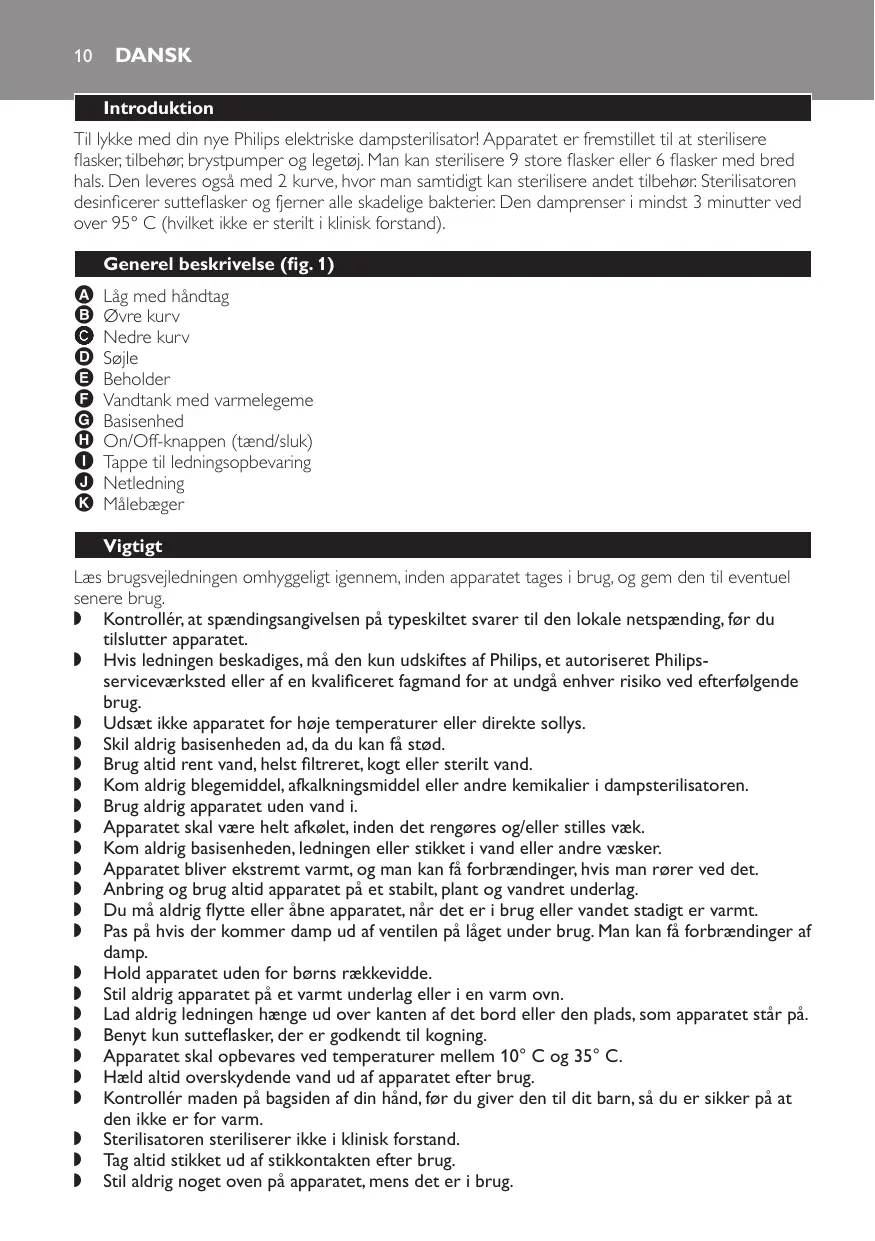 Dansk Introduktion Til lykke med din nye Philips elektriske dampsterilisator! Apparatet er fremstillet til at sterilisere flasker, tilbehør, brystpumper og legetøj. Man kan sterilisere 9 store flasker eller 6 flasker med bred hals. Den leveres også med 2 kurve, hvor man samtidigt kan sterilisere andet tilbehør. Sterilisatoren desinficerer sutteflasker og fjerner alle skadelige bakterier. Den damprenser i mindst 3 minutter ved over 95° C (hvilket ikke er sterilt i klinisk forstand). Generel beskrivelse (fig. 1)