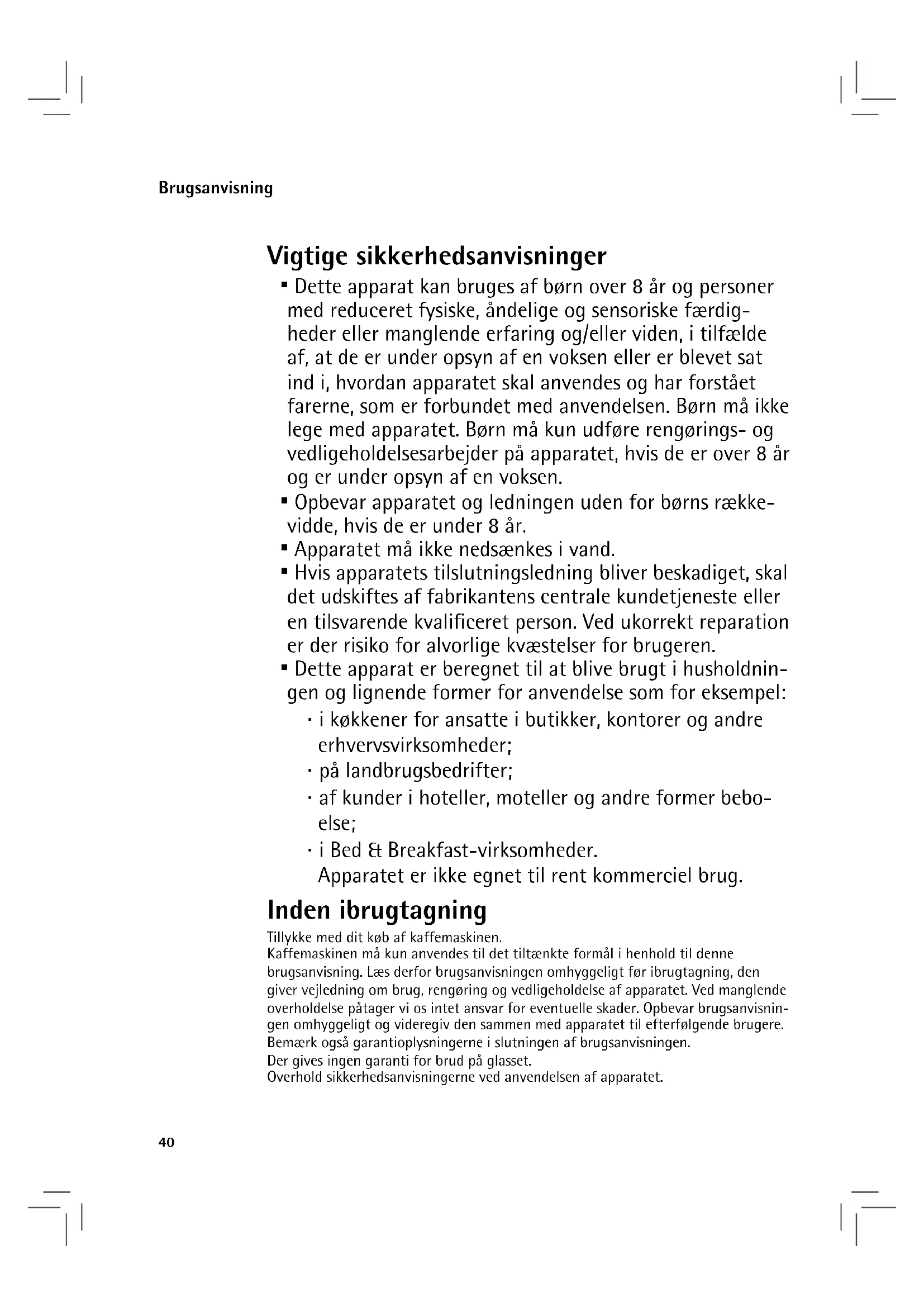 - Dette apparat er beregnet til at blive brugt i husholdnin- gen og lignende former for anvendelse som for eksempel: ⋅ i køkkener for ansatte i butikker, kontorer og andre erhvervsvirksomheder; ⋅ på landbrugsbedrifter; ⋅ af kunder i hoteller, moteller og andre former bebo- else; ⋅ i Bed & Breakfast-virksomheder. Apparatet er ikke egnet til rent kommerciel brug. Inden ibrugtagning Tillykke med dit køb af kaffemaskinen. Kaffemaskinen må kun anvendes til det tiltænkte formål i henhold til denne brugsanvisning. Læs derfor brugsanvisningen omhyggeligt før ibrugtagning, den giver vejledning om brug, rengøring og vedligeholdelse af apparatet. Ved manglende overholdelse påtager vi os intet ansvar for eventuelle skader. Opbevar brugsanvisnin- gen omhyggeligt og videregiv den sammen med apparatet til efterfølgende brugere. Bemærk også garantioplysningerne i slutningen af brugsanvisningen. Der gives ingen garanti for brud på glasset. Overhold sikkerhedsanvisningerne ved anvendelsen af apparatet. Brugsanvisning41