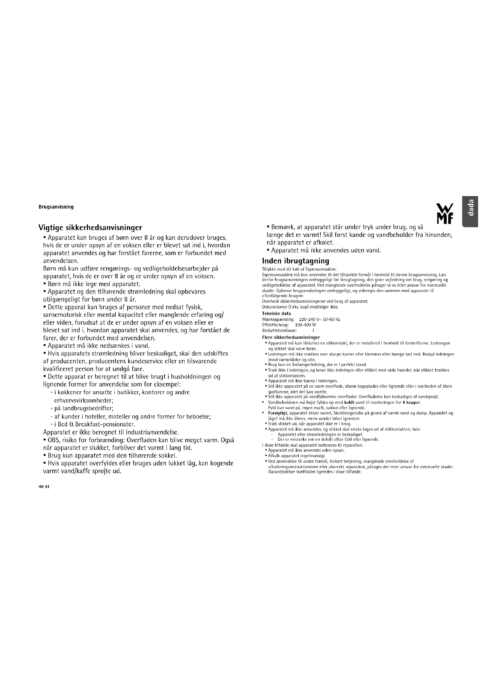 Download vejledningen til din Kaffemaskine i PDF-format gratis! Find din vejledning KITCHENminis 04.1241.0012 - WMF og tag din elektroniske enhed tilbage i hånden. På denne side er alle dokumenter nødvendige for brugen af din enhed offentliggjort. KITCHENminis 04.1241.0012 af mærket WMF.