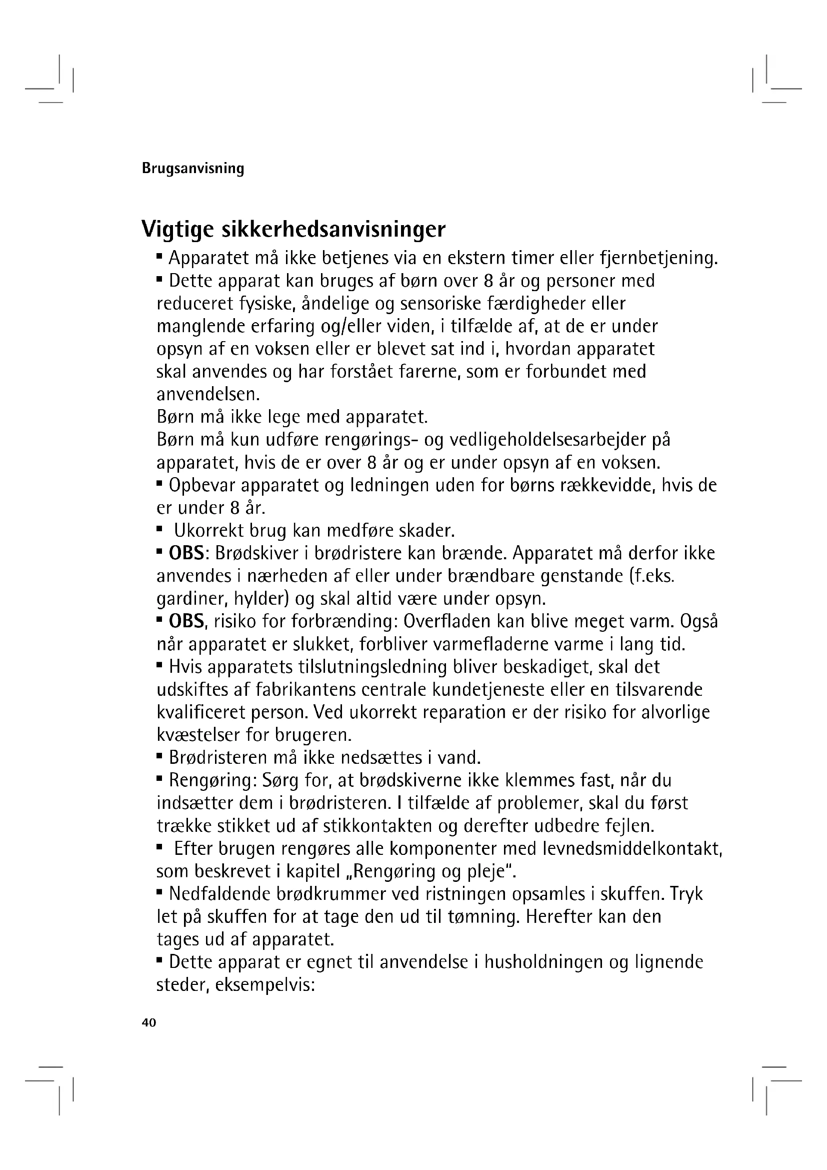 - OBS: Brødskiver i brødristere kan brænde. Apparatet mA derfor ikke anvendes iærheden af uller under brændbare genstande (f.eks. gardiner, hylder) og skal altidøre under opsyn.