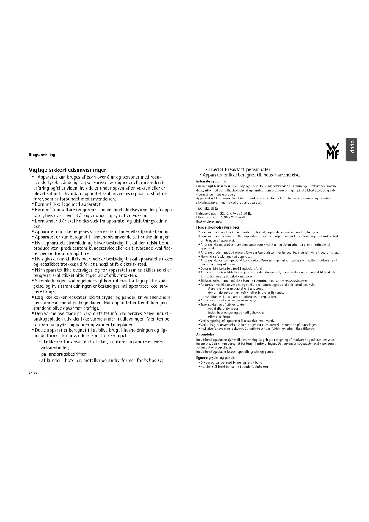 - Apparatet er ikke beregnet til industrianvendelse. Inden ibrugtagning Læs venligst brugsanvisningen nøje igennem. Den indeholder vigtige anvisninger vedrørende anven-delse, sikkerhed og vedligeholdelse af apparatet. Gem brugsanvisningen på et sikkert sted, og giv den videre til den næste bruger.Apparatet må kun anvendes til det tiltænkte formål i henhold til denne brugsanvisning. Overhold sikkerhedsanvisningerne ved brug af apparatet. Tekniske data Netspænding: 220-240 V~, 50-60 HzEffektforbrug: 1890 - 2205 wattBeskyttelsesklasse: I Flere sikkerhedsanvisninger