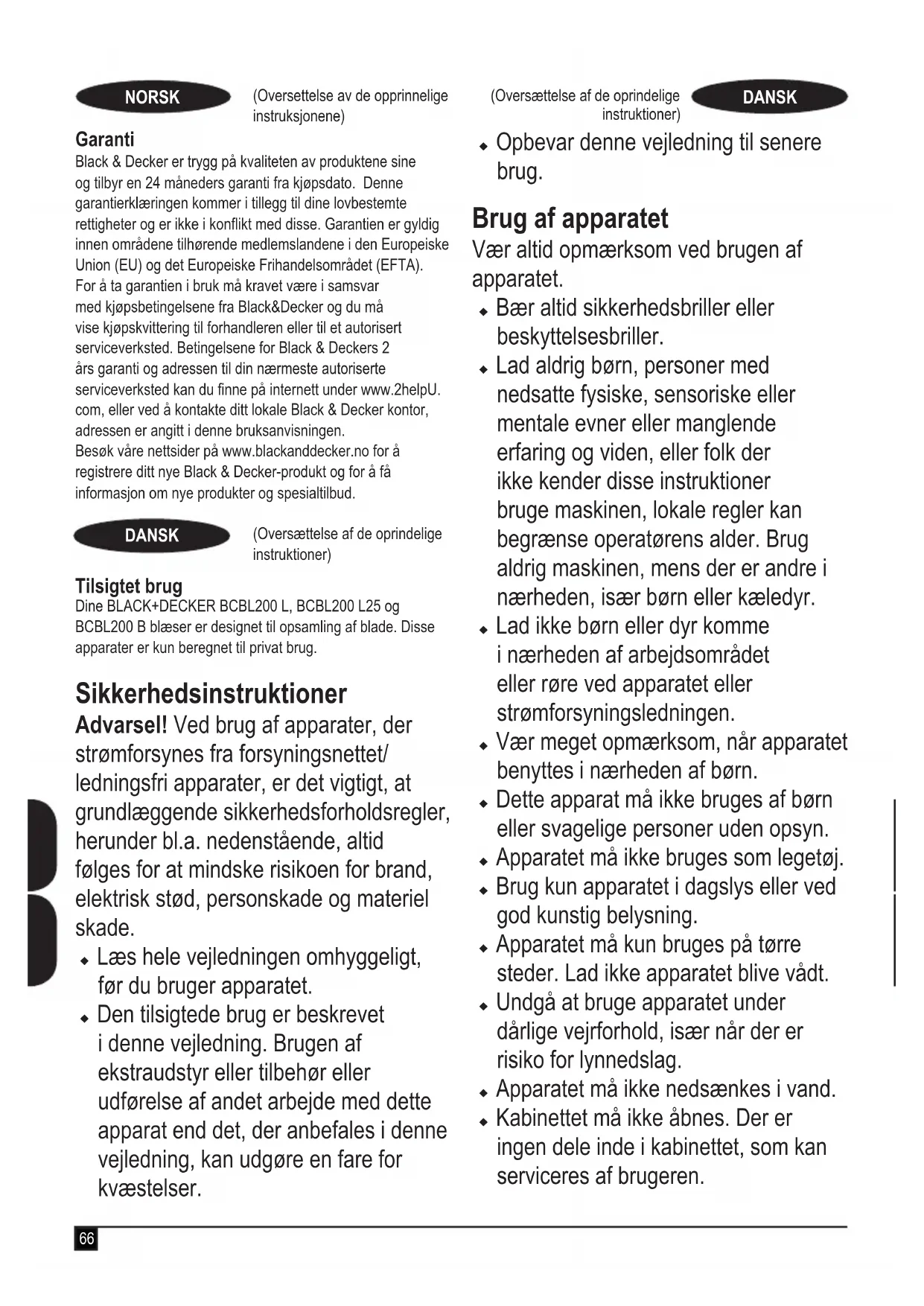 (Oversettelse av de opprinnelige instruksjonene) NORSK (Oversættelse af de oprindelige instruktioner) DANSK Garanti Black & Decker er trygg på kvaliteten av produktene sine og tilbyr en 24 måneders garanti fra kjøpsdato. Denne garantierklæringen kommer i tillegg til dine lovbestemte rettigheter og er ikke i konikt med disse. Garantien er gyldig innen områdene tilhørende medlemslandene i den Europeiske Union (EU) og det Europeiske Frihandelsområdet (EFTA). For å ta garantien i bruk må kravet være i samsvar med kjøpsbetingelsene fra Black&Decker og du må vise kjøpskvittering til forhandleren eller til et autorisert serviceverksted. Betingelsene for Black & Deckers 2 års garanti og adressen til din nærmeste autoriserte serviceverksted kan du nne på internett under www.2helpU. com, eller ved å kontakte ditt lokale Black & Decker kontor, adressen er angitt i denne bruksanvisningen. Besøk våre nettsider på www.blackanddecker.no for å registrere ditt nye Black & Decker-produkt og for å få informasjon om nye produkter og spesialtilbud. (Oversættelse af de oprindelige instruktioner) DANSK Tilsigtet brug Dine BLACK+DECKER BCBL200 L, BCBL200 L25 og BCBL200 B blæser er designet til opsamling af blade. Disse apparater er kun beregnet til privat brug. Sikkerhedsinstruktioner Advarsel! Ved brug af apparater, der strømforsynes fra forsyningsnettet/ ledningsfri apparater, er det vigtigt, at grundlæggende sikkerhedsforholdsregler, herunder bl.a. nedenstående, altid følges for at mindske risikoen for brand, elektrisk stød, personskade og materiel skade. u Læs hele vejledningen omhyggeligt, før du bruger apparatet. u Den tilsigtede brug er beskrevet i denne vejledning. Brugen af ekstraudstyr eller tilbehør eller udførelse af andet arbejde med dette apparat end det, der anbefales i denne vejledning, kan udgøre en fare for kvæstelser. u Opbevar denne vejledning til senere brug. Brug af apparatet Vær altid opmærksom ved brugen af apparatet. u Bær altid sikkerhedsbriller eller beskyttelsesbriller. u Lad aldrig børn, personer med nedsatte fysiske, sensoriske eller mentale evner eller manglende erfaring og viden, eller folk der ikke kender disse instruktioner bruge maskinen, lokale regler kan begrænse operatørens alder. Brug aldrig maskinen, mens der er andre i nærheden, især børn eller kæledyr. u Lad ikke børn eller dyr komme i nærheden af arbejdsområdet eller røre ved apparatet eller strømforsyningsledningen. u Vær meget opmærksom, når apparatet benyttes i nærheden af børn. u Dette apparat må ikke bruges af børn eller svagelige personer uden opsyn. u Apparatet må ikke bruges som legetøj. u Brug kun apparatet i dagslys eller ved god kunstig belysning. u Apparatet må kun bruges på tørre steder. Lad ikke apparatet blive vådt. u Undgå at bruge apparatet under dårlige vejrforhold, især når der er risiko for lynnedslag. u Apparatet må ikke nedsænkes i vand.u Kabinettet må ikke åbnes. Der er ingen dele inde i kabinettet, som kan serviceres af brugeren.67 (Oversættelse af de oprindelige instruktioner) DANSK u Brug ikke apparatet i eksplosive omgivelser, f.eks. hvor der er brændbare væsker, gasser eller støv. u Apparatet må kun bruges med den medfølgende strømforsyningsenhed. Resterende risici. Der kan opstå yderligere, tilbageværende risici under brugen af apparatet, som muligvis ikke behandles i de vedlagte sikkerhedsadvarsler. Disse risici kan opstå pga. forkert anvendelse, langvarig brug etc. Selv ved overholdelse af relevante sikkerhedsforskrifter og anvendelse af sikkerhedsudstyr kan visse restrisici ikke undgås. Disse omfatter: u Tilskadekomst forårsaget af berøring af berøring af roterende/bevægelige dele. u Tilskadekomst forårsaget af udskiftning af dele, klinger eller tilbehør. u Tilskadekomst forårsaget af langvarig brug af et værktøj. Husk at holde pause jævnligt ved brug af et apparat i længere tid. u Hørenedsættelse. u Sundhedsrisici forårsaget af indånding af støv, der genereres ved brug af værktøjet (eksempel: arbejde med træ, især, eg, bøg og MDF.) Efter brug u Opbevar apparatet på et tørt, godt ventileret sted uden for børns rækkevidde, når det ikke er i brug. u Børn må ikke have adgang til opbevarede apparater. u Når apparatet opbevares eller transporteres i et køretøj, skal det anbringes i bagagerummet eller fastgøres for at forhindre bevægelse som følge af pludselige ændringer i hastighed eller retning. Eftersyn og reparationer u Kontroller apparatet for beskadigede eller defekte dele før brug. Se efter knækkede dele og eventuelle andre forhold, der kan påvirke apparatets funktion. u Brug ikke apparatet med beskadigede eller defekte dele. u Få beskadigede eller defekte dele repareret eller udskiftet på et autoriseret værksted. u Forsøg aldrig at fjerne eller udskifte dele ud over dem, der er beskrevet i denne vejledning. Yderligere sikkerhedsvejledninger for blæsere Den tilsigtede brug er beskrevet i denne vejledning. Brug af ekstraudstyr eller tilbehør eller udførelse af andre opgaver med dette apparat end de, der anbefales i denne vejledning, kan medføre risiko for personskade og/eller materiel skade. u Brug altid kraftigt fodtøj og lange bukser til beskyttelse af fødder og ben under brugen af apparatet. u Sluk altid produktet, lad blæseren stoppe, og tag batteriet ud når:68 (Oversættelse af de oprindelige instruktioner) DANSK u Når du efterlader produktet uden opsyn. u Når du fjerner en blokering. u Når du kontrollerer, juster, rengør eller arbejder på produktet. u Hvis produktet begynder at vibrere unormalt. u Hold ikke indsugning eller udblæsning i nærheden af øjne eller ører under arbejdet. Blæs aldrig materiale mod omkringstående. u Brug ikke produktet i regnvejr, og lad det ikke ligge ude i regnvejr. u Passér ikke grusstier eller veje, mens produktet er tændt. Gå, løb ikke. u Sæt ikke produktet ned på grus, mens der er tændt for det. u Sørg