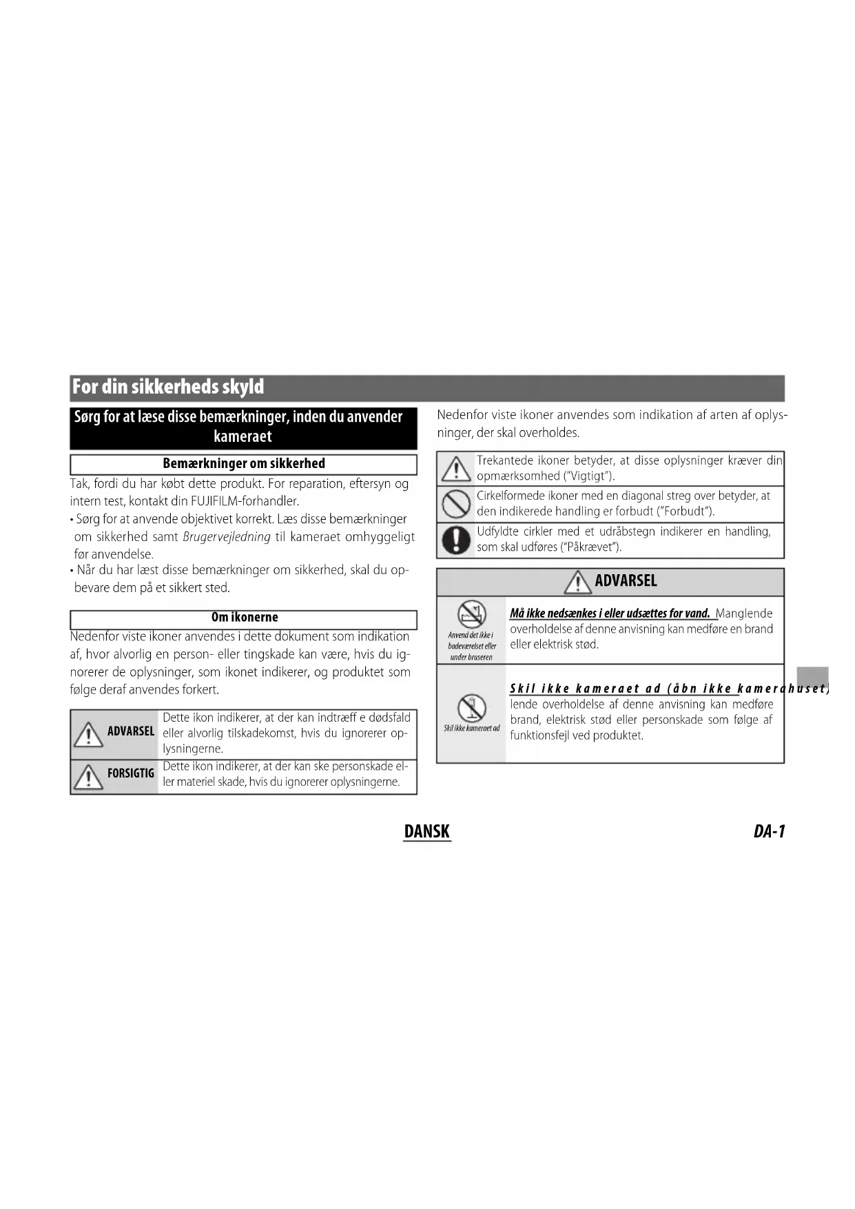 - Når du har læst disse bemærkninger om sikkerhed, skal du op- bevare dem på et sikkert sted. Om ikonerne Nedenfor viste ikoner anvendes i dette dokument som indikation af, hvor alvorlig en person- eller tingskade kan være, hvis du ig- norerer de oplysninger, som ikonet indikerer, og produktet som følge deraf anvendes forkert. ADVARSELDette ikon indikerer, at der kan indtræff e dødsfald eller alvorlig tilskadekomst, hvis du ignorerer op-lysningerne.FORSIGTIGDette ikon indikerer, at der kan ske personskade el-ler materiel skade, hvis du ignorerer oplysningerne. Nedenfor viste ikoner anvendes som indikation af arten af oplys- ninger, der skal overholdes. Trekantede ikoner betyder, at disse oplysninger kræver din opmærksomhed (”Vigtigt”).Cirkelformede ikoner med en diagonal streg over betyder, at den indikerede handling er forbudt (”Forbudt”).Udfyldte cirkler med et udråbstegn indikerer en handling, som skal udføres (“Påkrævet”). ADVARSEL ADVARSEL Anvend det ikke i badeværelset eller under bruserenMå ikke nedsænkes i eller udsættes for vand. Manglende overholdelse af denne anvisning kan medføre en brand eller elektrisk stød.Skil ikke kameraet adSkil ikke kameraet ad (åbn ikke kamerahuset). Mang-lende overholdelse af denne anvisning kan medføre brand, elektrisk stød eller personskade som følge af funktionsfejl ved produktet.DA-2 DANSK ADVARSEL ADVARSEL Rør ikke ved de indvendige dele Hvis kameraet går i stykker som følge af, at du taber det, eller der sker et andet uheld, må du ikke røre ved de dele, der kommer til syne. Manglende overholdelse af denne anvisning kan medføre elektrisk stød eller personskade ved berøring af de beskadigede dele. Tag øjeblikkeligt kameraets batteri ud - pas på, at du ikke kommer til skade eller får elektrisk stød - og indlevér produktet til eftersyn på købsstedet. Må ikke anbringes på ustabile over ader. Produktet kan falde ned og medføre tilskadekomst. Se ikke på solen gennem objektivets eller kameraets søger. Manglende overholdelse af denne anvisning kan med- føre permanent skade på synet. FORSIGTIG FORSIGTIG Må ikke anvendes eller opbevares på steder med damp el- ler røg, eller som er meget fugtige eller ekstremt støvede. Manglende overholdelse af denne anvisning kan med- føre brand eller elektrisk stød. Må ikke efterlades i direkte sollys eller på steder med me- get høje temperaturer, såsom i et lukket køretøj på en solrig dag. Manglende overholdelse af denne anvisning kan medføre brand. FORSIGTIG FORSIGTIG Opbevar kameraet utilgængeligt for små børn. Dette pro- dukt kan medføre personskade, når det er i hænderne på børn. Må ikke håndteres med våde hænder. Manglende over- holdelse af denne anvisning kan medføre elektrisk stød. Hold sollyset væk fra billedet, når du tager billeder af mo- tiver i modlys. Hvis sollyset fokuseres i kameraet, når solen er i eller tæt på billedet kan medføre brand eller forbrændinger. Når produktet ikke anvendes, skal du sætte objektivdæks- le rne på igen og opbevare det på et sted ud en direkte sol lys. Sollys fokuseret af objektivet kan medføre brand eller forbrændinger. Bær ikke kameraet eller objektivet, mens de er monteret på et stativ. Produktet kan falde ned eller ramme andre genstande og medføre tilskadekomst.DA-3 DANSK Bortska else af elektrisk og elektronisk udstyr i private husholdninger Bortska else af elektrisk og elektronisk udstyr i private husholdninger I EU, Norge, Island og Liechtenstein: Dette symbol på produktet eller i brugervejledningen og i garantien og/eller på emballagen bety- der, at dette produkt ikke bør behandles som husholdningsaff ald. Det bør i stedet afl everes på et egnet indsamlingssted for genbrug af elektrisk og elektronisk udstyr. Når du sikrer en korrekt bortskaff else af dette produkt, bidrager du til at fore- bygge potentielle negative konsekvenser for miljø og folkesundhed, som ellers vil kunne opstå ved uhensigtsmæssig aff aldshåndtering af dette produkt. Genbrug af materialet bidrager til at bevare naturens ressourcer. For mere detaljerede oplysninger om genbrug af dette produkt, bedes du kontakte de lokale myndigheder, dit lokale renovationsfi rma eller den forretning, hvor du har købt produktet. I lande uden for EU, Norge, Island og Liechtenstein: Hvis du ønsker at kassere dette produkt, herunder batterier eller akkumulatorer, bedes du kontakte de lokale myndigheder og få anvist den korrekte bortskaff elsesprocedure.DA-4 DANSK Før anvendelse af dette produkt Visse objektivfunktioner er ikke tilgængelige med ældre versioner af kameraets rmware. Sørg for at opdatere kameraets rmware til den nyeste version. Du kan nde instruktioner i visning af kameraets rmwareversion samt opdatering af kameraets rmware på følgende hjemmeside: http://www.fujifilm.com/support/digital_cameras/ software/#firmware Hvis du ikke har adgang til en computer, kan du få support hos den lokale forhandler op- stillet i materialet ”FUJIFILM verdensomspæn- dende netværk”, der følger med dit kamera. Produktvedligeholdelse
