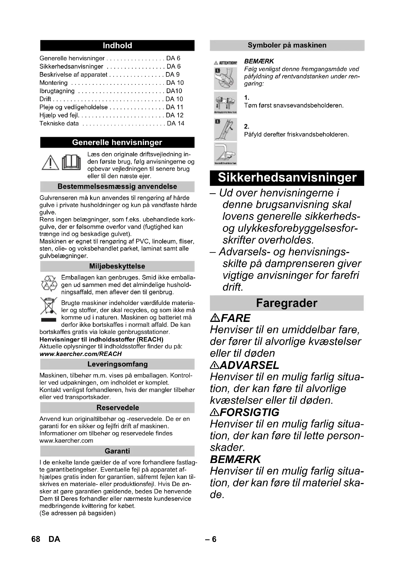 500 rpm Capacidade de carga Tanque de água fresca 360 ml depósito de água suja 140 ml Dimensões Peso (sem acessórios e líquidos de limpeza) 2,4 kg Comprimento 305 mm Largura 226 mm Altura 1220 mm Comprimento do cabo Carregador 1800 mm 67PT– 6 Læs den originale driftsvejledning in-den første brug, følg anvisningerne og opbevar vejledningen til senere brug eller til den næste ejer.Gulvrenseren må kun anvendes til rengøring af hårde gulve i private husholdninger og kun på vandfaste hårde gulve.Rens ingen belægninger, som f.eks. ubehandlede kork-gulve, der er følsomme overfor vand (fugtighed kan trænge ind og beskadige gulvet).Maskinen er egnet til rengøring af PVC, linoleum, fliser, sten, olie- og voksbehandlet parket, laminat samt alle gulvbelægninger.Emballagen kan genbruges. Smid ikke emballa-gen ud sammen med det almindelige hushold-ningsaffald, men aflever den til genbrug.Brugte maskiner indeholder værdifulde materia-ler og stoffer, der skal recycles, og som ikke må komme ud i naturen. Maskinen og batteriet må derfor ikke bortskaffes i normalt affald. De kan bortskaffes gratis via lokale genbrugsstationer.Henvisninger til indholdsstoffer (REACH)Aktuelle oplysninger til indholdsstoffer finder du på: www.kaercher.com/REACHMaskinen, tilbehør m.m. vises på emballagen. Kontrol-ler ved udpakningen, om indholdet er komplet.Kontakt venligst forhandleren, hvis der mangler tilbehør eller ved transportskader. Anvend kun originaltilbehør og -reservedele. De er en garanti for en sikker og fejlfri drift af maskinen.Informationer om tilbehør og reservedele findes www.kaercher.comI de enkelte lande gælder de af vore forhandlere fastlag-te garantibetingelser. Eventuelle fejl på apparatet af-hjælpes gratis inden for garantien, såfremt fejlen kan til-skrives en materiale- eller produktionsfejl. Hvis De øn-sker at gøre garantien gældende, bedes De henvende Dem til Deres forhandler eller nærmeste kundeservice medbringende kvittering for købet.(Se adressen på bagsiden) – Ud over henvisningerne i denne brugsanvisning skal lovens generelle sikkerheds- og ulykkesforebyggelsesfor- skrifter overholdes. – Advarsels- og henvisnings- skilte på damprenseren giver vigtige anvisninger for farefri drift. FARE Henviser til en umiddelbar fare, der fører til alvorlige kvæstelser eller til døden 몇 ADVARSEL Henviser til en mulig farlig situa- tion, der kan føre til alvorlige kvæstelser eller til døden. 몇 FORSIGTIG Henviser til en mulig farlig situa- tion, der kan føre til lette person- skader. BEMÆRK Henviser til en mulig farlig situa- tion, der kan føre til materiel ska- de. Indhold Generelle henvisninger . . . . . . . . . . . . . . . . . DA 6Sikkerhedsanvisninger . . . . . . . . . . . . . . . . . DA 6Beskrivelse af apparatet . . . . . . . . . . . . . . . . DA 9Montering . . . . . . . . . . . . . . . . . . . . . . . . . . . DA 10Ibrugtagning . . . . . . . . . . . . . . . . . . . . . . . . . DA10Drift . . . . . . . . . . . . . . . . . . . . . . . . . . . . . . . . DA 10Pleje og vedligeholdelse . . . . . . . . . . . . . . . . DA 11Hjælp ved fejl. . . . . . . . . . . . . . . . . . . . . . . . . DA 12Tekniske data . . . . . . . . . . . . . . . . . . . . . . . . DA 14 Generelle henvisninger Bestemmelsesmæssig anvendelse Miljøbeskyttelse Leveringsomfang Reservedele Garanti Symboler på maskinen BEMÆRKFølg venligst denne fremgangsmåde ved påfyldning af rentvandstanken under ren-gøring: Tøm først snavsevandsbeholderen. Påfyld derefter friskvandsbeholderen. Sikkerhedsanvisninger Faregrader 68 DA– 7 FARE Dyk ikke maskinen i vand! Kontroller at renser og tilbe- hør er korrekt og i orden før brug. Hvis maskinen ikke er i en fejlfri tilstand, må den ikke benyttes. Ved synlige skader skal opla- deapparatet med opladekab- let omgående erstattes med originale dele. Før alle service- og vedlige- holdelsesarbejder skal ma- skinen afbrydes og stikket trækkes ud. Reparationsarbejder på damprenseren må kun udfø- res af den autoriserede kun- deservice. Apparatet indeholder elektri- ske komponenter, disse må ikke renses under rindende vand! Stik ingen ledende genstande (f.eks. skruetrækker eller lig- nende) ind i opladebøsnin- gen. Berør ingen kontakter eller ledninger. Angivelsen af spænding på typeskiltet skal stemme over- ens med forsyningsspændin- gen. Træk tilslutningskablet ikke over skarpe kanter og sørg for at kablet ikke klemmes ind. 몇 ADVARSEL Maskinen skal altid tilsluttes et elektrisk stik, der er instal- leret af en el-installatør iht. IEC 603064. Maskinen må kun sluttes til vekselstrøm. Spændingen skal svare til angivelsen på ty- peskiltet. Af sikkerhedsgrunde anbefa- ler vi principielt at maskinen anvendes over en fejlstrøm- beskyttelseskontakt (max. 30mA). FARE Risiko for elektrisk stød. Rør aldrig ved netstik og stik- kontakt med fugtige hænder. Brug ladeapparatet aldrig til- smudset eller vådt. Opladeren må ikke bruges i områder med eksplosionsfa- re. Bær ladeapparatet aldrig på kablet. Opladeren må kun bruges og opbevares i tørre rum. Hold netkablet fjernt fra var- me, skarpe kanter, olie og be- vægende dele. Undgå at bruge forlængel- sesledninger sammen med stikdåser til mange stikkon- takter. Træk stikkontakten ikke ud af stikdåsen ved at trække i led- ningen. ladeapparater må ikke tildæk- kes og apparatets åbninger skal holdes fri. Åbn ikke for ladeapparater. Reparationer må kun gen- Elektriske Komponenter Oplader 69DA– 8 nemføres af sagkyndigt per- sonale. Brug opladeapparatet kun til opladning af godkendte akku- er. Ved synlige skader skal opla- deapparatet med opladekab- let omgående erstattes med originale dele. FARE Risiko for elektrisk stød. Udsæt ikke batteriet for direk- te sol, vamr eller ild. 몇 ADVARSEL Oplad batteriet med den ved- lagte originale oplader eller en af KÄRCHER godkendt oplader. Anvend følgende adapter: Batteriet må ikke åbnes, der er fare for en kortslutning, yderligere