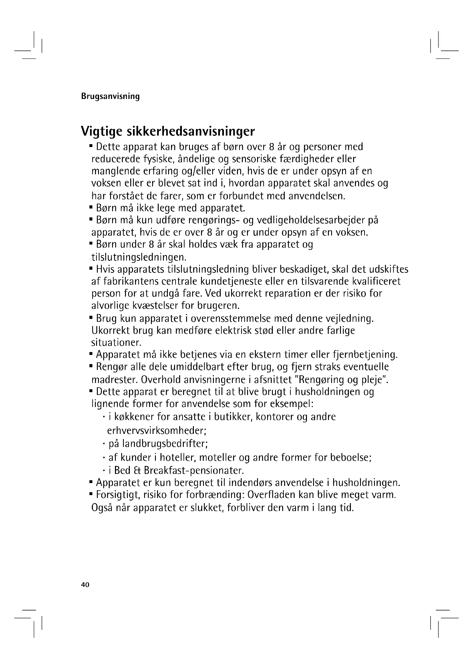 - Dette apparat kan bruges af børn over 8 år og personer med reducerede fysiske, åndelige og sensoriske færdigheder eller manglende erfaring og/eller viden, hvis de er under opsyn af en voksen eller er blevet sat ind i, hvordan apparatet skal anvendes og har forstået de farer, som er forbundet med anvendelsen.