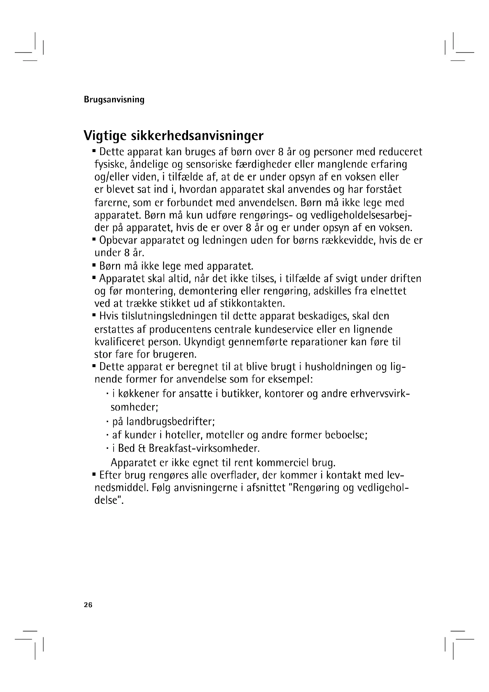 brug, sikkerhed og vedligeholdelse af apparatet. Den skal opbevares omhyggeligt