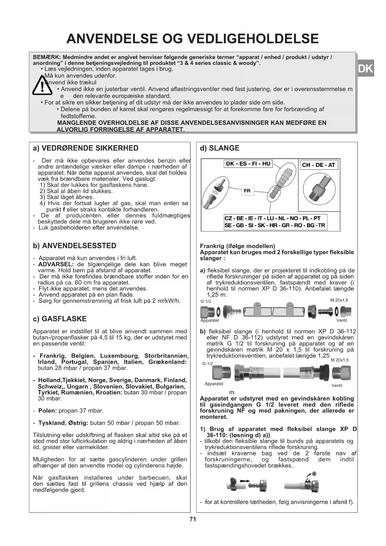 /kW/h. c) GASFLASKE Apparatet er indstillet til at blive anvendt sammen med butan-/propanflasker på 4,5 til 15 kg, der er udstyret med en passende ventil: - Frankrig, Belgien, Luxembourg, Storbritannien, Irland, Portugal, Spanien, Italien, Grækenland: butan 28 mbar / propan 37 mbar. - Holland,Tjekkiet, Norge, Sverige, Danmark, Finland, Schweiz,, Ungarn , Slovenien, Slovakiet, Bulgarien, Tyrkiet, Rumænien, Kroatien: butan 30 mbar / propan 30 mbar. - Polen: propan 37 mbar. - Tyskland, Østrig: butan 50 mbar / propan 50 mbar. Tilslutning eller udskiftning af flasken skal altid ske på et sted med stor luftcirkulation og aldrig i nærheden af åben ild, gnister eller varmekilder. Muligheden for at sætte gascylinderen under grillen afhænger af den anvendte model og cylinderens højde. Når gasflasken installeres under barbecuen, skal den sættes fast til grillens chassis ved hjælp af den medfølgende gjord. d) SLANGE Frankrig (ifølge modellen) Apparatet kan bruges med 2 forskellige typer fleksible slanger : a) fleksibel slange, der er projekteret til indkobling på de riflede forskruninger på siden af apparatet og på siden af trykreduktionsventilen, fastspændt med kraver (i henhold til normen XP D 36-110). Anbefalet længde 1,25 m. b) fleksibel slange (i henhold til normen XP D 36-112 eller NF D 36-112) udstyret med en gevindskåren møtrik G 1/2 til forskruning på apparatet og af en gevindskåren møtrik M 20 x 1,5 til forskruning på trykreduktionsventilen, anbefalet længde 1,25