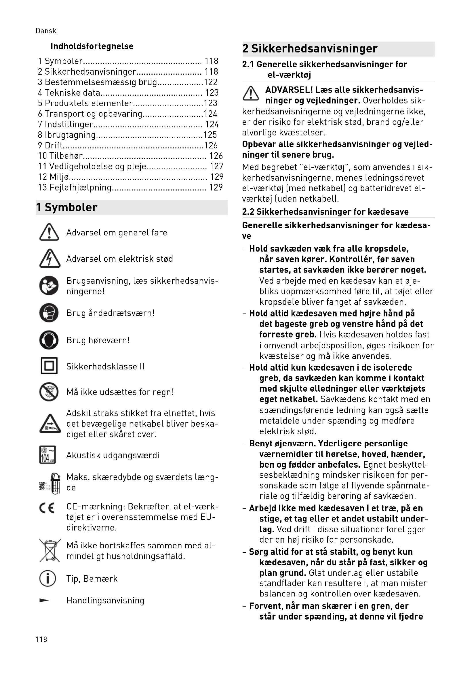– Anvend ikke el-værktøjet til andet end det tiltænkte formål. Det er forbudt at benytte el-værktøjet som stationær sav. – Det er forbudt for uvedkommende personer at berøre el-værktøjet og dets netkabel. – De gældende lovbestemmelser på områ det arbejdssikkerhed, sikkerhedsanvis ningerne og øvrige, generelt gældende sundheds- og arbejdsregler skal ubetin get overholdes. Producenten hæfter ikke for skader, der er opstået som følge af uautoriserede ændringer på el-værktøjet. – Anvend egnede detektorer for at identifi cere skjulte forsyningsledninger, eller spørg det lokale forsyningsselskab. Hvis indsatsværktøjet får kontakt med en spæn dingsførende ledning, kan det medføre brand og elektrisk stød. Beskadigelse af en gasledning kan medføre en eksplosion. Gennemtrængning af et vandrør medfører materielle skader. – Under arbejdet skal der anvendes beskyt telsesbriller og høreværn, der opfylder de nationale forskrifter for personlige værne midler. Bær skærebeskyttelsesdragt eller skærebeskyttelsesbukser. Bær solidt fod tøj med skridsikre såler. Bær ikke løse jak Dansk 119ker, halstørklæder, smykker osv., der kan blive fanget af savkæden. – For at overholde kapslingsklassen skal saven sikkerhedstestes. Dette arbejde skal udføres på et elektroteknisk værksted. – Vi anbefaler at benytte en fejlstrømsafbry der med en triggerstrøm på 30 mA eller mindre. – Udendørs må der kun anvendes forlænger ledninger, der er godkendt til det og mær ket tilsvarende. Forlængerledningen skal kontrolleres regelmæssigt og straks ud skiftes ved beskadigelse. – Vær opmærksom på miljøets påvirkninger. Lad ikke el-værktøjet stå ude i regnvejr, og benyt det ikke i våde eller fugtige omgivel ser. Sørg for god belysning af arbejdsplad sen, og arbejd ikke med el-værktøjet i nær heden af brændbare væsker og gasser. Det varme el-værktøj må ikke henlægges et sted, hvor det kan antænde en brand, og det skal holdes i ren tilstand. – Kontrollér regelmæssigt det bevægelige netkabel, og i tilfælde af en beskadigelse skal du lade et specialværksted udskifte det. Benyt ikke det bevægelige netkabel til at bære el-værktøjet eller til at trække stikket ud af modul stikdåsen. Kablet skal beskyttes mod høje temperaturer, mod olie og mod overgange over skarpe kanter. – Inden hver brug af el-værktøjet skal alle beskyttelsesafdækninger og elementer samt de bevægelige dele kontrolleres. Alle dele skal være anbragt rigtigt, og alle be tingelser for korrekt drift af el-værktøjet skal være opfyldt. Beskadigede beskyttel sesafdækninger og elementer skal repare res fagmæssigt på et autoriseret værksted. Beskadigede kontakter skal udskiftes på et autoriseret værksted. Benyt ikke el-værk tøjet, hvis kontakterne ikke kan tændes el ler slukkes. – Undgå, at kontakten sætter sig fast i positi onen TIL. – Værktøjerne skal plejes omhyggeligt. Kun med skarpt og rent værktøj kan man arbej de virkelig godt og sikkert. Mangelfulde, sløve værktøjer eller værktøjer med uegne de mål må ikke anvendes. Følg anvisnin gerne om værktøjets vedligeholdelse og om værktøjsskift. – Anvend aldrig sløve eller beskadigede kæ der. Ved brug af uslebne eller forkert ind stillede kæder opstår der en højere belast ning, hvilket kan medføre, at kæden øde lægges og kan forårsage personskade som følge deraf. – Anvend kun tilbehør anbefalet af producen ten eller specialtilbehør. – Beskyttelseslisten må ikke fjernes eller modificeres. – Beskyttelseslisten er en fast bestanddel af el-værktøjet. Det er forbudt at tilpasse, for korte eller afmontere denne. Sørg for, at den ligger i sværdets plan, og at kæden er spændt rigtigt og ikke berører beskyttel seslisten. Kædens mindsteafstand til be skyttelseslisten er 5 mm. – Beskyttelseslisten er kun funktionsdygtig, når den ligger i skærenoten. Beskyttelses listen forhindrer ikke tilbageslag ved korte savsnit. – Hvis beskyttelseslisten er bøjet, må der ik ke arbejdes med saven. – Beskyttelsesafdækningerne og beskyttel sesmidlerne må generelt ikke fjernes, og deres rigtige funktion må ikke indskræn kes. – Anvend altid kun sværd, kæder og kæde hjul, der er anbefalet af producenten. Sværdet skal altid fastgøres rigtigt. – Kæder med kædetænder til stationært el- værktøj må ikke anvendes. – Sav ikke i emner, der er for store eller for små til el-værktøjet. – Neddykning er ikke mulig på grund af kon struktionen med beskyttelseslisten. Det er forbudt at fjerne beskyttelseslisten. – Indstik (neddykning) med kørende værktøj i hele, lukkede flader er forbudt. Fare for personskade som følge af el-værktøjets til bageslag! – Når el-værktøjet ikke benyttes eller ved re paration eller værktøjskift, skal stikket på det bevægelige netkabel trækkes ud af mo dul stikdåsen. Sikkert arbejde Før start – Sørg for at holde orden på din arbejds plads. Uorden på arbejdspladsen kan føre til en arbejdsulykke. – Før det bevægelige netkabel, så det ikke kan blive fanget af værktøjet, og så det ikke udgør en ekstra farekilde, som man f.eks. kan snuble i. Dansk 120– Ved drift af el-værktøjet i et lukket rum skal der sørges for tilstrækkelig ventilation eller anvendes en udsugning. Undgå at sa ve i sundhedsskadelige materialer som f.eks. asbest. – Før du begynder at arbejde, skal du kon trollere niveauet af smøreolie og den rigti ge smørefunktion. – Kontrollér, at den originale kædehjulsaf dækning er komplet. Hvis den originale kædehjulsafdækning skulle være ufuld stændig eller beskadiget, må den ikke an vendes. Man må heller ikke erstatte den med andre komponenter, f.eks. med mø trikker. Spændesystemet er konstrueret specielt til din sav med henblik på optimal funktion og på arbejdssikkerhed. – Før du begynder at save, skal indstillings armen til vipning og til vinkelindstilling af sværdet sp