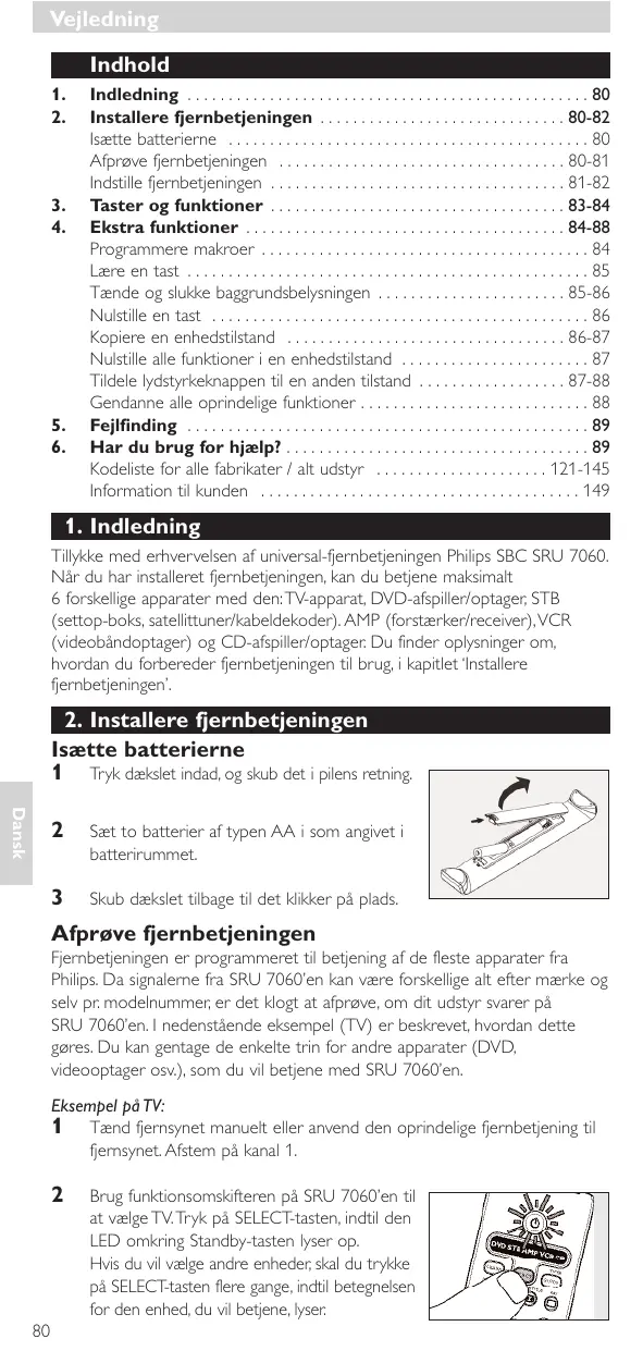 Tillykke med erhvervelsen af universal-fjernbetjeningen Philips SBC SRU 7060. Når du har installeret fjernbetjeningen, kan du betjene maksimalt 6 forskellige apparater med den:TV-apparat, DVD-afspiller/optager, STB (settop-boks, satellittuner/kabeldekoder). AMP (forstærker/receiver),VCR (videobåndoptager) og CD-afspiller/optager. Du finder oplysninger om, hvordan du forbereder fjernbetjeningen til brug, i kapitlet ‘Installere fjernbetjeningen’.