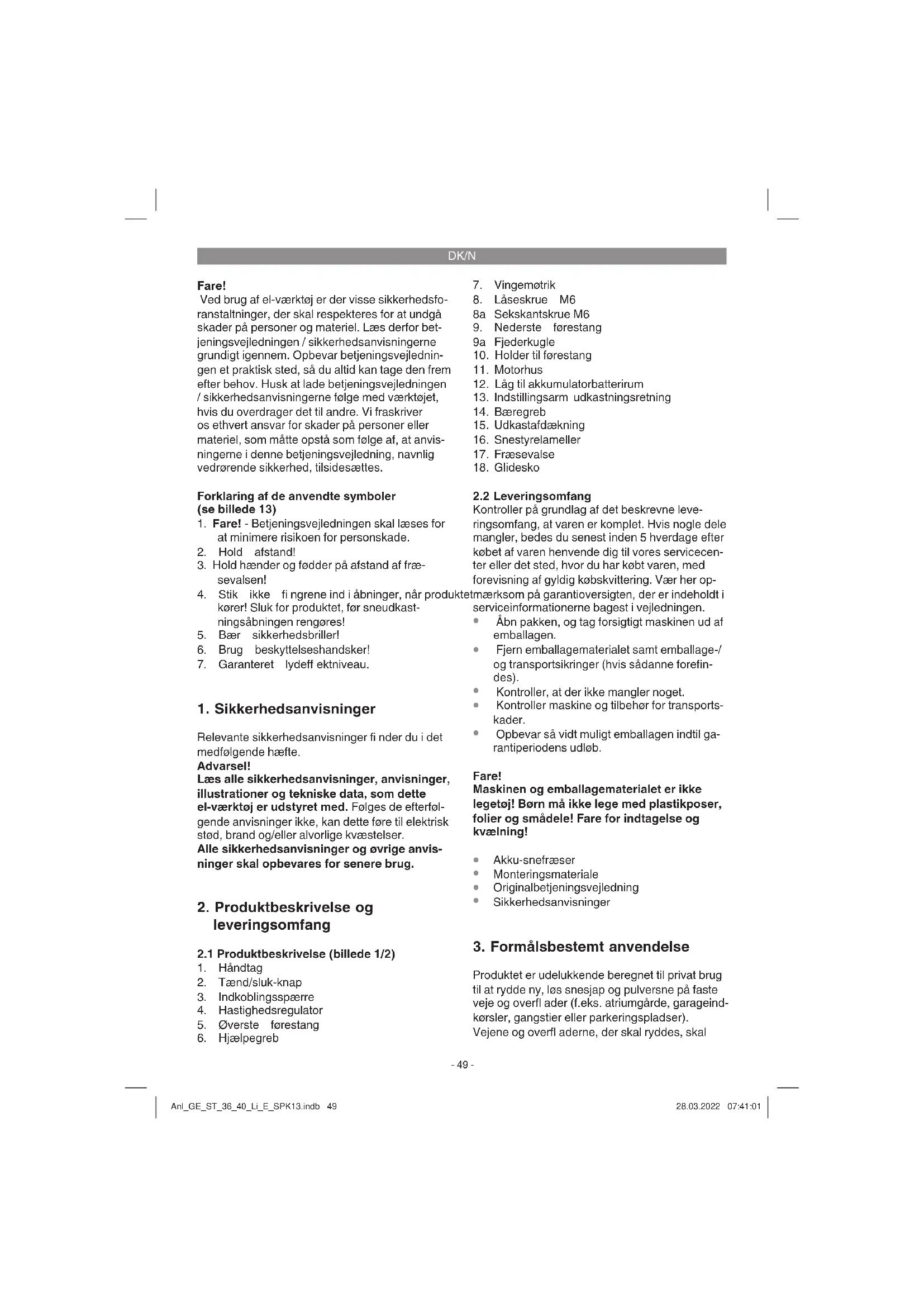 Produktet er udelukkende beregnet til privat brug til at rydde ny, løs snesjap og pulversne på faste veje og overfl ader (f.eks. atriumgårde, garageind- kørsler, gangstier eller parkeringspladser). Vejene og overfl aderne, der skal ryddes, skal Anl_GE_ST_36_40_Li_E_SPK13.indb 49Anl_GE_ST_36_40_Li_E_SPK13.indb 49 28.03.2022 07:41:0128.03.2022 07:41:01DK/N