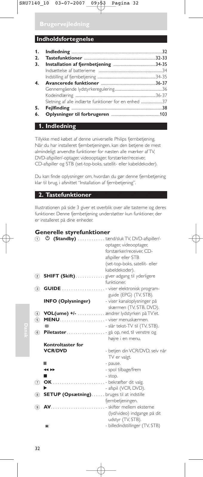 Dansk Tasten SHIFT (Skift) anvendes til at få adgang til yderligere funktioner for den aktuelle enhedstilstand, f.eks. menu, afslut, markør osv. Ikke alle koder har yderligere funktioner. Sådan får du adgang til yderligere funktioner: SRU7140_10 03-07-2007 09:53 Pagina 34 Brugervejledning Installation af fjernbetjening Indsættelse af batterierne