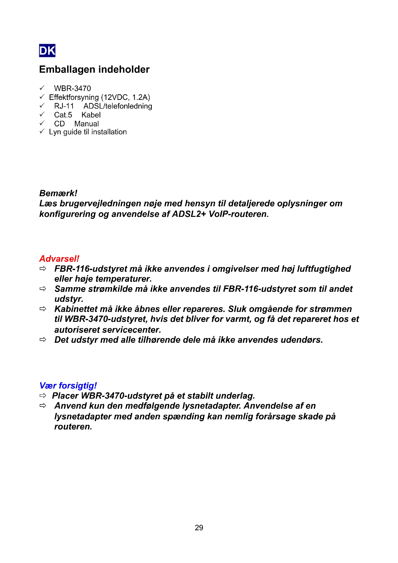 Advarsel! FBR-116-udstyret må ikke anvendes i omgivelser med høj luftfugtighed eller høje temperaturer. Samme strømkilde må ikke anvendes til FBR-116-udstyret som til andet udstyr. Kabinettet må ikke åbnes eller repareres. Sluk omgående for strømmen til WBR-3470-udstyret, hvis det bliver for varmt, og få det repareret hos et autoriseret servicecenter. Det udstyr med alle tilhørende dele må ikke anvendes udendørs.
