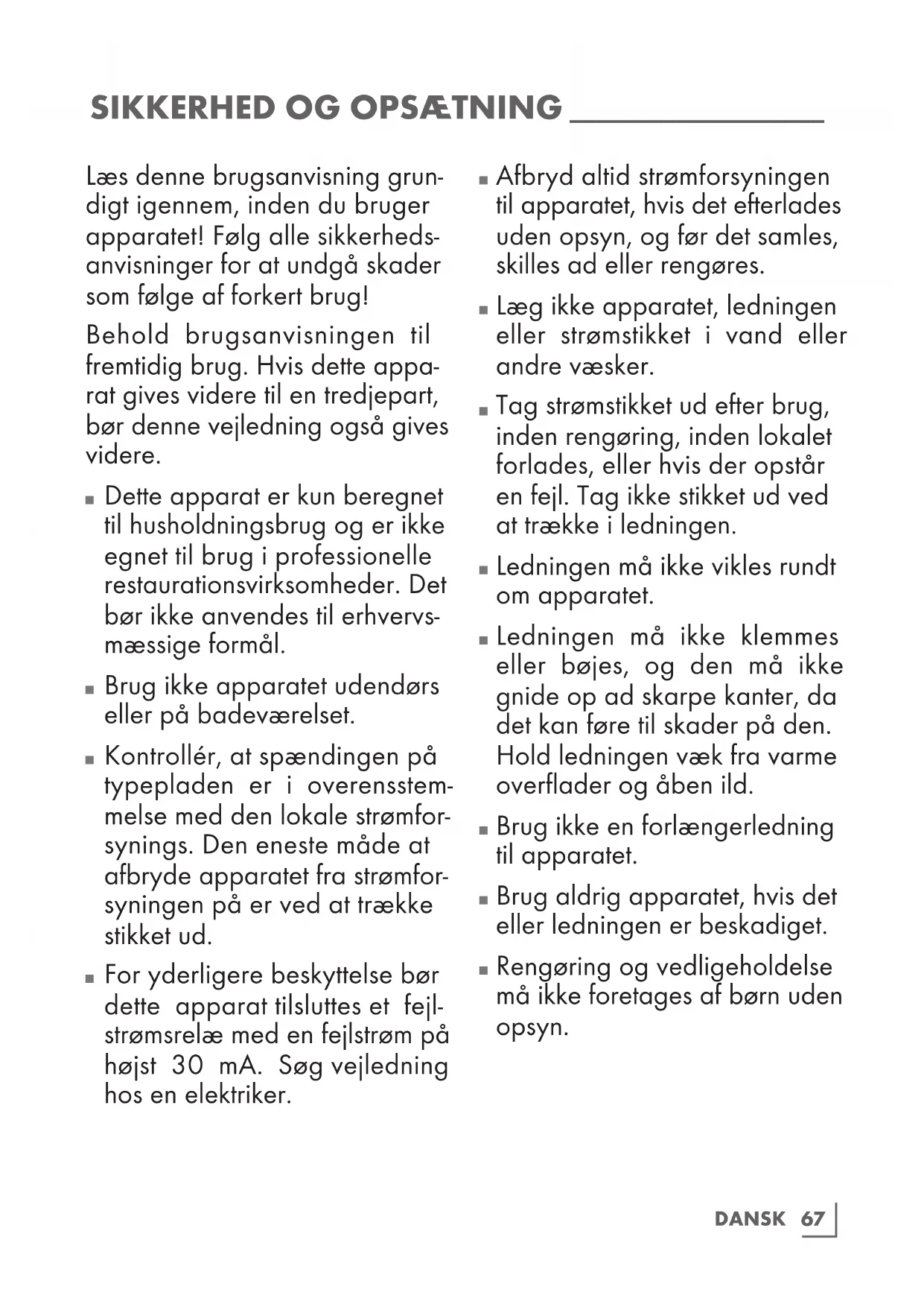 Dette apparat er kun beregnet til husholdningsbrug og er ikke egnet til brug i professionelle restaurationsvirksomheder. Det bør ikke anvendes til erhvervs- mæssige formål.