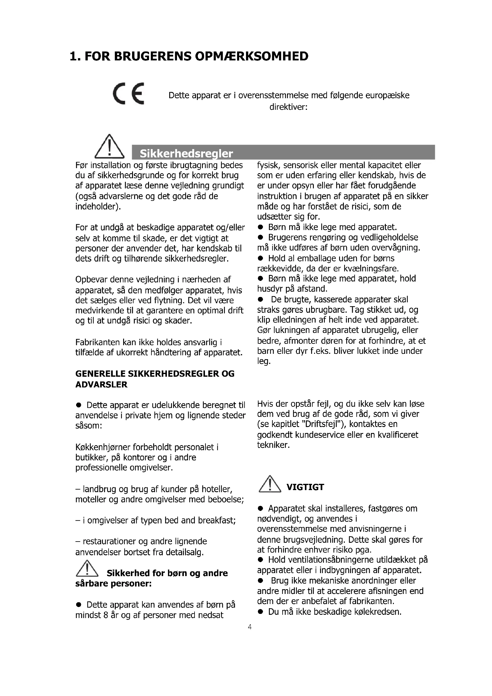 ADVARSLER Dette apparat er udelukkende beregnet til anvendelse i private hjem og lignende steder såsom: Køkkenhjørner forbeholdt personalet i butikker, på kontorer og i andre professionelle omgivelser. – landbrug og brug af kunder på hoteller, moteller og andre omgivelser med beboelse; – i omgivelser af typen bed and breakfast; – restaurationer og andre lignende anvendelser bortset fra detailsalg. Sikkerhed for børn og andre sårbare personer: Dette apparat kan anvendes af børn på mindst 8 år og af personer med nedsat fysisk, sensorisk eller mental kapacitet eller som er uden erfaring eller kendskab, hvis de er under opsyn eller har fået forudgående instruktion i brugen af apparatet på en sikker måde og har forstået de risici, som de udsætter sig for. Børn må ikke lege med apparatet. Brugerens rengøring og vedligeholdelse må ikke udføres af børn uden overvågning. Hold al emballage uden for børns rækkevidde, da der er kvælningsfare. Børn må ikke lege med apparatet, hold husdyr på afstand. De brugte, kasserede apparater skal straks gøres ubrugbare. Tag stikket ud, og klip elledningen af helt inde ved apparatet. Gør lukningen af apparatet ubrugelig, eller bedre, afmonter døren for at forhindre, at et barn eller dyr f.eks. bliver lukket inde under leg. Hvis der opstår fejl, og du ikke selv kan løse dem ved brug af de gode råd, som vi giver (se kapitlet "Driftsfejl"), kontaktes en godkendt kundeservice eller en kvalificeret tekniker. VIGTIGT Apparatet skal installeres, fastgøres om nødvendigt, og anvendes i overensstemmelse med anvisningerne i denne brugsvejledning. Dette skal gøres for at forhindre enhver risiko pga. Hold ventilationsåbningerne utildækket på apparatet eller i indbygningen af apparatet. Brug ikke mekaniske anordninger eller andre midler til at accelerere afisningen end dem der er anbefalet af fabrikanten. Du må ikke beskadige kølekredsen.5 Du må ikke bruge elektriske apparater inden i apparatets område for opbevaring af madvarer medmindre de er af en type, der er godkendt af fabrikanten. Du må ikke opbevare eksplosive stoffer i apparatet, såsom spraydåser med brandbare gasser. Du må aldrig udsætte apparatet for åben ild. Sluk apparatet og tag ledningen ud af stikkontakten før rengøring eller flytning. På modeller med vandfordeler eller afdeling til isterninger, må du kun fylde eller tilslutte med drikkevand. Hvis el-kablet beskadiges, skal det udskiftes af fabrikanten eller dennes kundeservice eller en lignende kvalificeret person for at undgå enhver fare. Midlerne til køling og isolering, der er anvendt i dette apparat, indeholder brandbare gasser. Når du vil kassere apparatet ved end brugslevetid, skal du indlevere det på en godkendt miljøplads. Du må aldrig udsætte apparatet for åben ild. Kølevæske Dette apparats kølekreds indeholder isobutan kølemiddel (R600a) i lukket kreds. Det er en kølegas, der er mere miljøvenlig, men ikke desto mindre yderst brandfarlig. Under transport og installation af apparatet, skal du sikre dig, at ingen af kølemiddelkomponenterne bliver beskadiget. Vigtigt: Risiko for brand Hvis kølemiddelkredsen er blevet beskadiget: -Undgå åbne flammer og enhver antændelseskilde. -Udluft rummet godt, hvor apparatet står. Det er farligt at ændre sammensætningen af dette apparat, uanset på hvilken måde. Al skade på elledningen kan fremkalde kortslutning og/eller elektrisk stød. Bortskaffelse Dette symbol angiver at dette apparat ikke må behandles som almindeligt husholdningsaffald. Apparatet indeholder mange materialer, der kan genbruges. Dette angives med den illustrerede tegning for at vise, at brugte apparater ikke må blandes sammen med almindeligt husholdningsaffald. Kontakt teknisk forvaltning i kommunen eller forhandleren for at få at vide, hvor brugte apparater kan afleveres i nærheden af din bopæl. Genvindingen af apparater, som producenten organiserer, sker under de mest optimale betingelser i overensstemmelse med EU's direktiv om affald af elektrisk og elektronisk udstyr. Vi takker for dit samarbejde med hensyn til at beskytte miljøet. Nogle af emballagematerialerne til dette apparat kan genbruges. Du kan sørge for dette og dermed være med til at beskytte miljøet ved at bortskaffe dem på genbrugspladsen. I overensstemmelse med de seneste lovlige bestemmelser med hensyn til miljøbeskyttelse og -hensyn indeholder apparatet ikke H,F.C., men en kølegas kaldet R600a. Den nøjagtige kølegastype, der anvendes i apparatet er iøvrigt angivet tydeligt på typeskiltet, som befinder sig indvendigt i køleskabet, på venstre indervæg forneden. R600a er en gas, der ikke forurener, som ikke skader ozonlaget, og6 hvis bidrag til drivhuseffekten er næsten ikke-eksisterende.