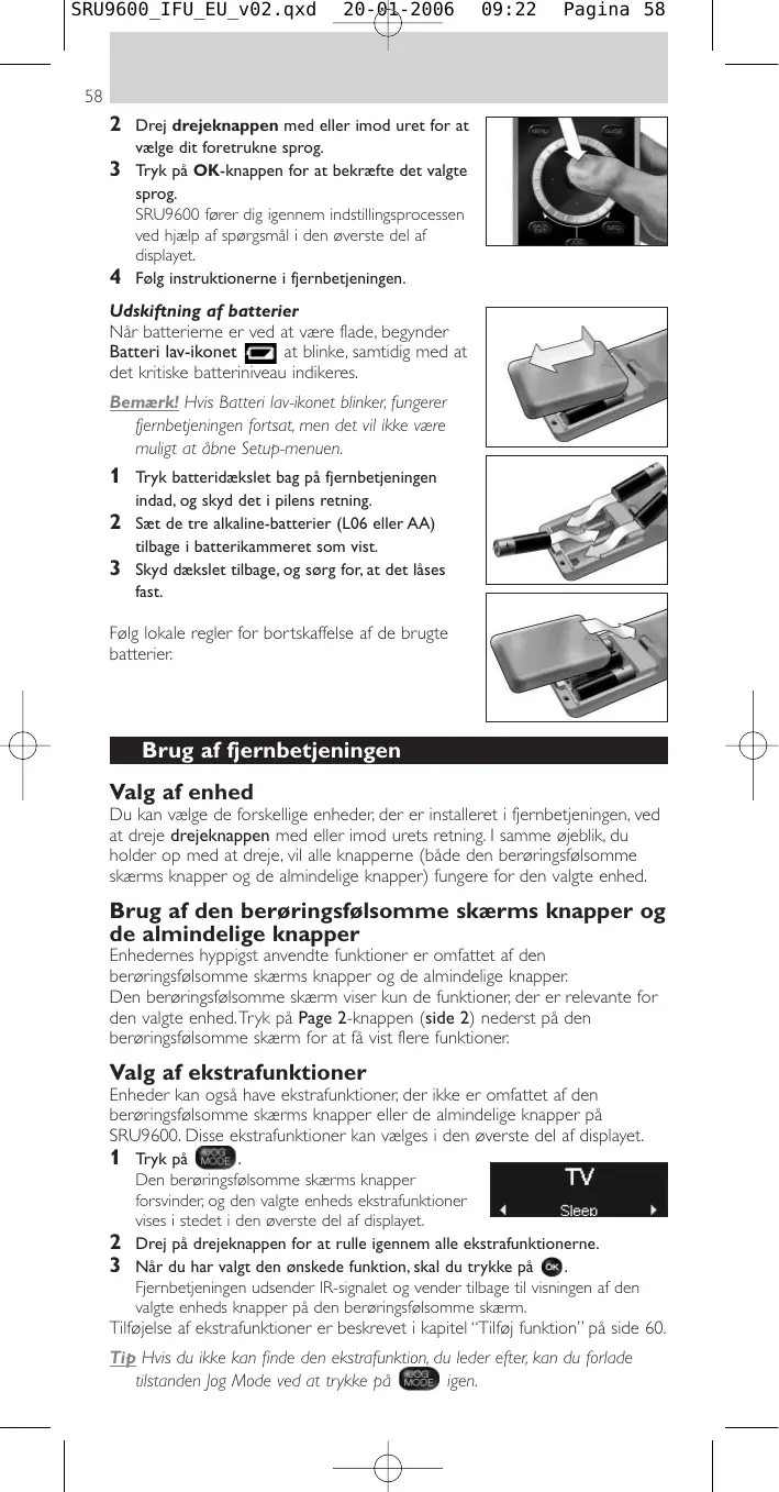 Tryk batteridækslet bag på fjernbetjeningen indad, og skyd det i pilens retning. Sæt de tre alkaline-batterier (L06 eller AA) tilbage i batterikammeret som vist. Skyd dækslet tilbage, og sørg for, at det låses fast. Følg lokale regler for bortskaffelse af de brugte batterier. Brug af fjernbetjeningen Valg af enhed Du kan vælge de forskellige enheder, der er installeret i fjernbetjeningen, ved at dreje drejeknappen med eller imod urets retning. I samme øjeblik, du holder op med at dreje, vil alle knapperne (både den berøringsfølsomme skærms knapper og de almindelige knapper) fungere for den valgte enhed. Brug af den berøringsfølsomme skærms knapper og de almindelige knapper Enhedernes hyppigst anvendte funktioner er omfattet af den berøringsfølsomme skærms knapper og de almindelige knapper. Den berøringsfølsomme skærm viser kun de funktioner, der er relevante for den valgte enhed.Tryk på Page 2-knappen (side 2) nederst på den berøringsfølsomme skærm for at få vist flere funktioner. Valg af ekstrafunktioner Enheder kan også have ekstrafunktioner, der ikke er omfattet af den berøringsfølsomme skærms knapper eller de almindelige knapper på SRU9600. Disse ekstrafunktioner kan vælges i den øverste del af displayet.