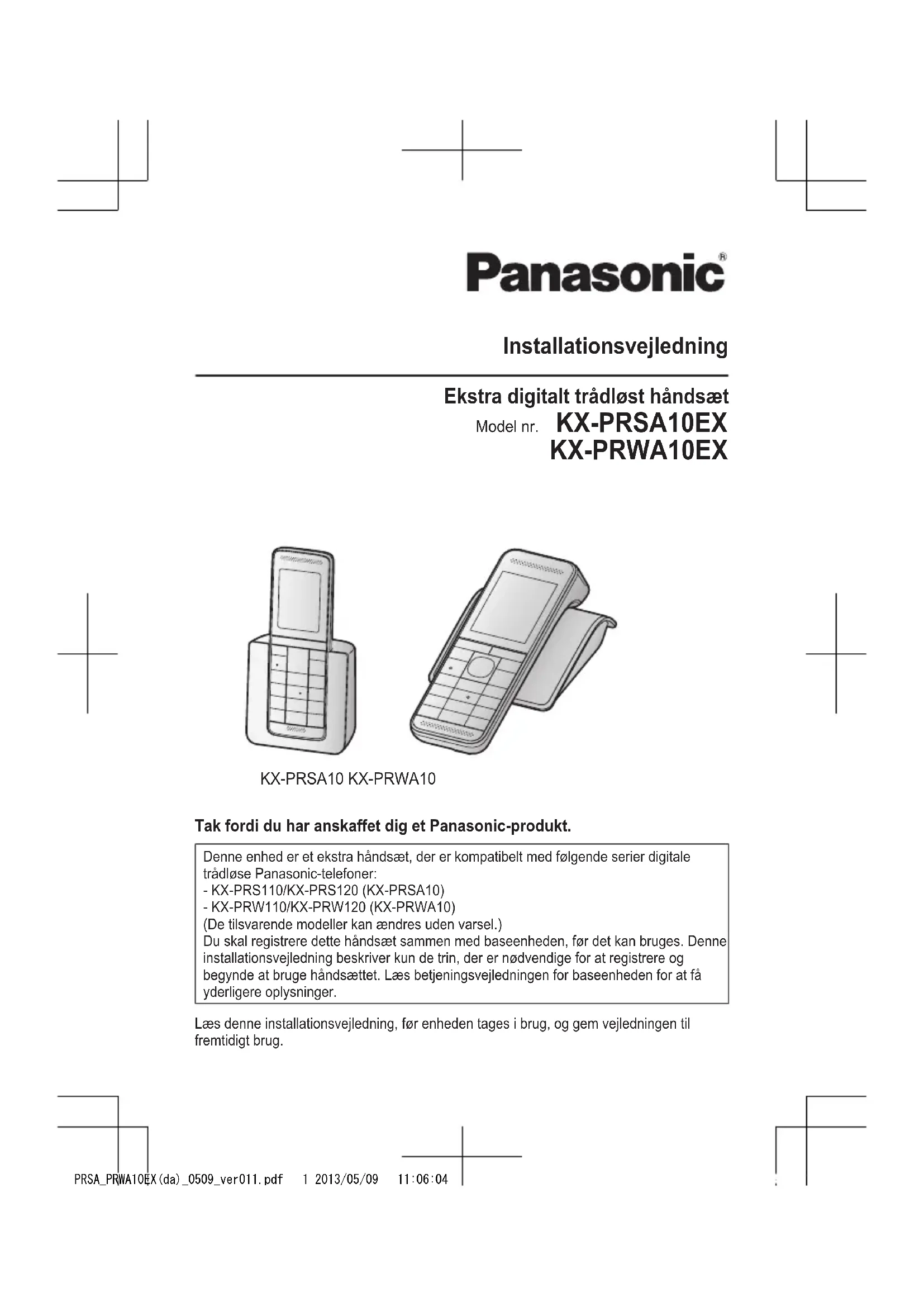 PRSA_PRWA10EX(el)_0509_ver011.pdf 8 2013/05/09 11:05:31Installationsvejledning Ekstra digitalt trådløst håndsæt Model nr. KX-PRSA10EX KX-PRWA10EX KX-PRSA10 KX-PRWA10 Tak fordi du har anskaffet dig et Panasonic-produkt. Denne enhed er et ekstra håndsæt, der er kompatibelt med følgende serier digitale trådløse Panasonic-telefoner: - KX-PRS110/KX-PRS120 (KX-PRSA10) - KX-PRW110/KX-PRW120 (KX-PRWA10) (De tilsvarende modeller kan ændres uden varsel.) Du skal registrere dette håndsæt sammen med baseenheden, før det kan bruges. Denne installationsvejledning beskriver kun de trin, der er nødvendige for at registrere og begynde at bruge håndsættet. Læs betjeningsvejledningen for baseenheden for at få yderligere oplysninger. Læs denne installationsvejledning, før enheden tages i brug, og gem vejledningen til fremtidigt brug. PRSA_PRWA10EX(da)_0509_ver011.pdf 1 2013/05/09 11:06:04Information om tilbehør Medfølgende tilbehør Tilbehør/del nr. Antal Oplader 1 Lysnetadapter/PNLV233CE 1 Genopladelige batterier