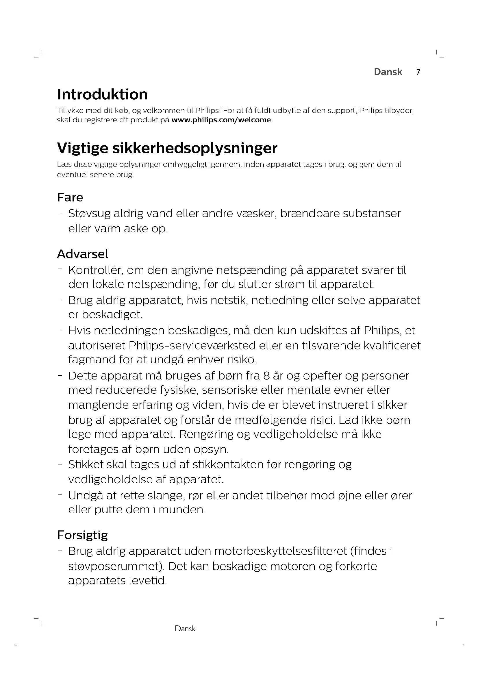 EnglishDansk Introduktion Tillykke med dit køb, og velkommen til Philips! For at få fuldt udbytte af den support, Philips tilbyder,skal du registrere dit produkt på www.philips.com/welcome. Vigtige sikkerhedsoplysninger Læs disse vigtige oplysninger omhyggeligt igennem, inden apparatet tages i brug, og gem dem tileventuel senere brug. Fare