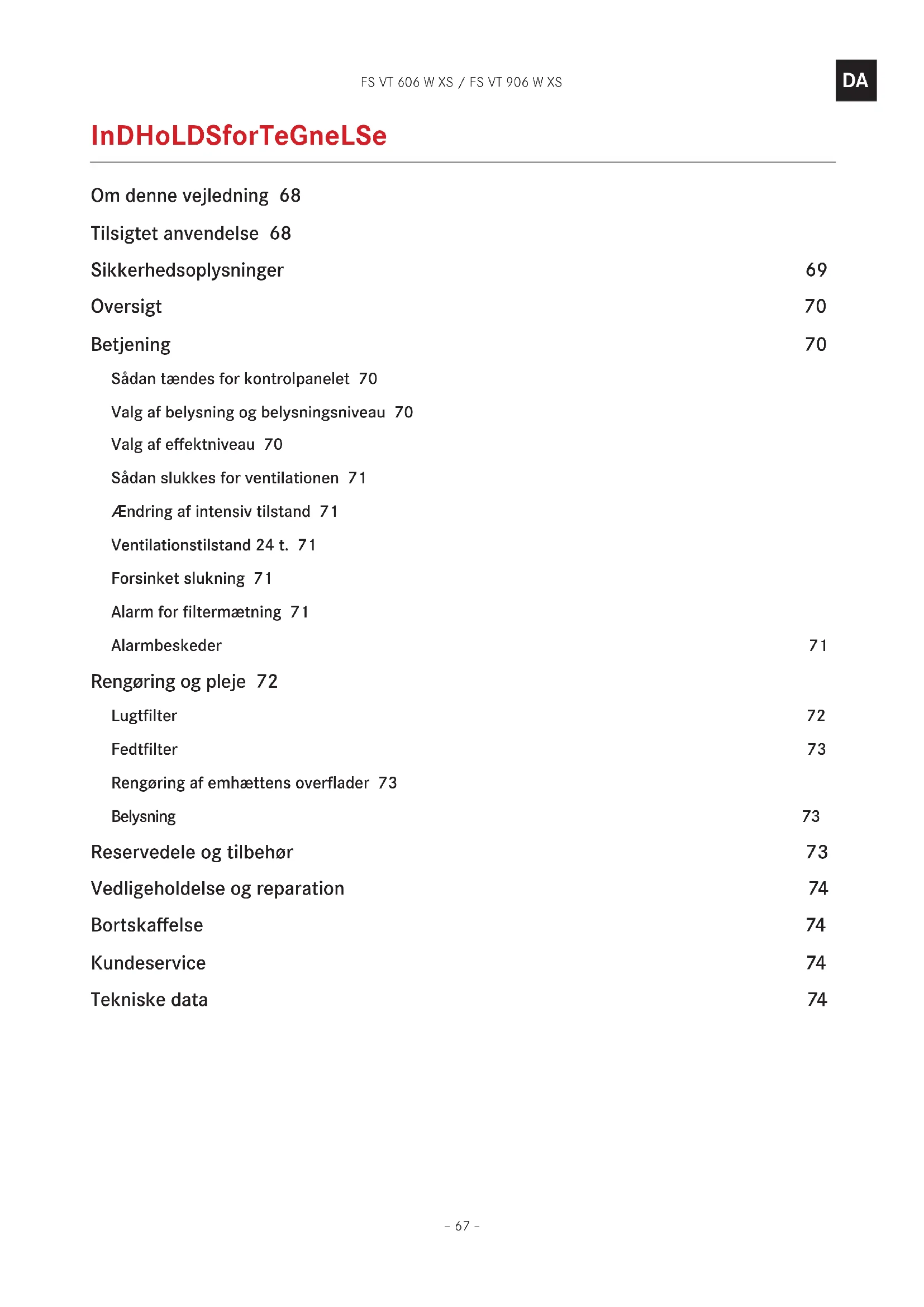 indholdsforTegnelse Om denne vejledning 68 Tilsigtet anvendelse 68 Sikkerhedsoplysninger 69 Oversigt 70 Betjening 70 Sådan tændes for kontrolpanelet 70 Valg af belysning og belysningsniveau 70 Valg af effektniveau 70 Sådan slukkes for ventilationen 71 Ændring af intensiv tilstand 71 Ventilationstilstand 24 t. 71 Forsinket slukning 71 Alarm for filtermætning 71 Alarmbeskeder 71 Rengøring og pleje 72 Lugtfilter 72 Fedtfilter 73 Rengøring af emhættens overflader 73 Belysning 73 Reservedele og tilbehør 73 Vedligeholdelse og reparation 74 Bortskaffelse 74 Kundeservice 74 Tekniske data 74FS VT 606 W XS / FS VT 906 W XS – 68 –