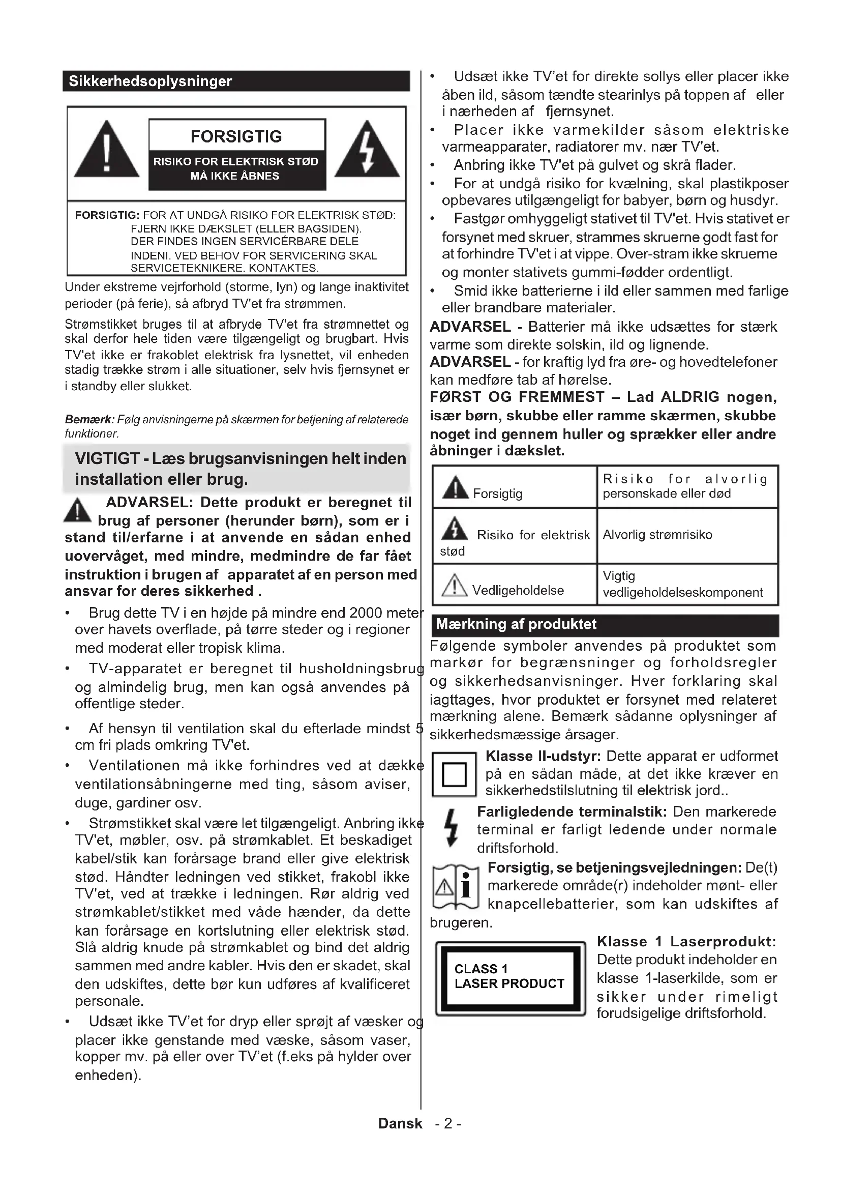 Forsigtig, se betjeningsvejledningen: De(t) markerede område(r) indeholder mønt- eller knapcellebatterier, som kan udskiftes af brugeren. CLASS 1 LASER PRODUCT Klasse 1 Laserprodukt: Dette produkt indeholder en klasse 1-laserkilde, som er sikker under rimeligt forudsigelige driftsforhold.Dansk - 3 - ADVARSEL Batteriet må ikke sluges. Giver risiko for kemiske ætsningsskader Dette produkt eller tilbehøret, som leveres sammen med produktet, kan indeholde et batteri i knapstørrelse. Hvis knapcellebatteriet sluges, kan det medføre alvorlige indre ætse-skader på bare 2 timer, hvilket kan være livsfarligt. Opbevar nye og brugte batterier utilgængeligt for børn. Hvis batteridækslet ikke lukker ordentligt, skal du stoppe med at bruge produktet og opbevare det utilgængeligt for børn. Hvis du har mistanke om at batterier kan være blevet slugt eller placeret inde i en del af kroppen, skal du straks søge lægehjælp. – – – – – – – – – – – – Anbring aldrig et TV-apparat på et ustabilt sted. Et TV kan falde ned og forårsage alvorlig personskade eller død. Mange skader, især for børn, kan undgås ved at tage simple forholdsregler, såsom: