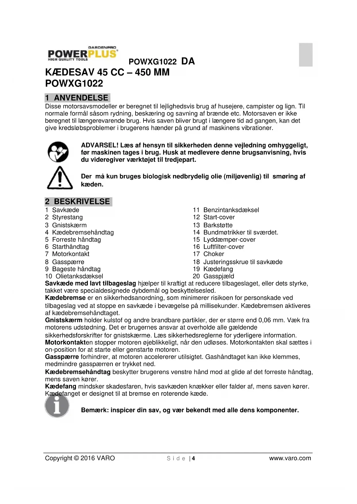 POWXG1022 1 ANVENDELSE Disse motorsavsmodeller er beregnet til lejlighedsvis brug af husejere, campister og lign. Til normale formål såsom rydning, beskæring og savning af brænde etc. Motorsaven er ikke beregnet til længerevarende brug. Hvis saven bliver brugt i længere tid ad gangen, kan det give kredsløbsproblemer i brugerens hænder på grund af maskinens vibrationer. ADVARSEL! Læs af hensyn til sikkerheden denne vejledning omhyggeligt, før maskinen tages i brug. Husk at medlevere denne brugsanvisning, hvis du videregiver værktøjet til tredjepart. Der må kun bruges biologisk nedbrydelig olie (miljøvenlig) til smøring af kæden. 2 BESKRIVELSE 1 Savkæde 2 Styrestang 3 Gnistskærm 4 Kædebremsehåndtag 5 Forreste håndtag 6 Starthåndtag 7 Motorkontakt 8 Gasspærre 9 Bageste håndtag 10 Olietanksdæksel 11 Benzintanksdæksel 12 Start-cover 13 Barkstøtte 14 Bundmøtrikker til sværdet. 15 Lyddæmper-cover 16 Luftfilter-cover 17 Choker 18 Justeringsskrue til savkæde 19 Kædefang 20 Gasspjæld Savkæde med lavt tilbageslag hjælper til kraftigt at reducere tilbageslaget, eller dets styrke, takket være specialdesignede dybdemål og beskyttelsesled. Kædebremse er en sikkerhedsanordning, som minimerer risikoen for personskade ved tilbageslag ved at stoppe en savkæde i bevægelse på millisekunder. Kædebremsen aktiveres af kædebremsehåndtaget. Gnistskærm holder kulstof og andre brandbare partikler, der er større end 0,06 mm. Væk fra motorens udstødning. Det er brugernes ansvar at overholde alle gældende sikkerhedsforskrifter for gnistskærme. Læs sikkerhedsreglerne for yderligere information. Motorkontakten stopper motoren øjeblikkeligt, når den udløses. Motorkontakten skal sættes i on-position for at starte eller genstarte motoren. Gasspærre forhindrer, at motoren accelererer utilsigtet. Gashåndtaget kan ikke klemmes, medmindre gasspærren er trykket ned. Kædebremsehåndtag beskytter brugerens venstre hånd mod at glide af det forreste håndtag, mens saven kører. Kædefang mindsker skadesfaren, hvis savkæden knækker eller falder af, mens saven kører. Kædefanget er designet til at bremse en roterende kæde. Bemærk: inspicer din sav, og vær bekendt med alle dens komponenter.POWXG1022 DA Copyright © 2016 VARO S i d e | 5 www.varo.com ADVARSEL Pas på tilbageslag. Hold motorsaven i et godt greb når du bruger den. Læs og overhold, for din egen sikkerheds skyld, alle sikkerhedsforskrifterne i denne vejledning før du bruger motorsaven. Forkert anvendelse kan forårsage alvorlige skader. ADVARSEL! Ved brug af benzindrevne maskiner skal de grundlæggende sikkerhedsforskrifter, inklusiv dem herunder, altid overholdes for at reducere risikoen for alvorlige personskader og/eller beskadigelse af maskinen.