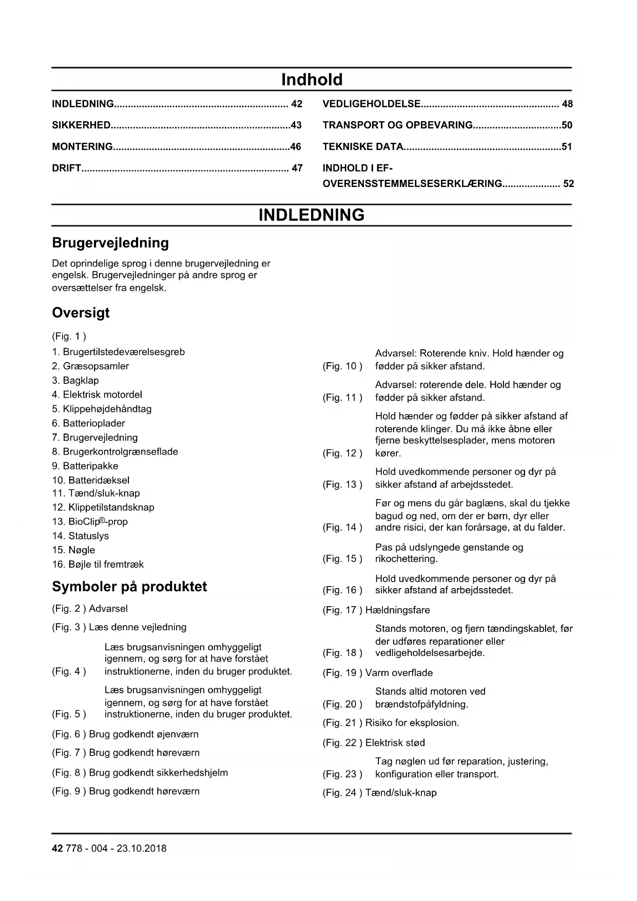 Symboler på produktet (Fig. 2 ) Advarsel (Fig. 3 ) Læs denne vejledning (Fig. 4 ) Læs brugsanvisningen omhyggeligt igennem, og sørg for at have forstået instruktionerne, inden du bruger produktet. (Fig. 5 ) Læs brugsanvisningen omhyggeligt igennem, og sørg for at have forstået instruktionerne, inden du bruger produktet. (Fig. 6 ) Brug godkendt øjenværn (Fig. 7 ) Brug godkendt høreværn (Fig. 8 ) Brug godkendt sikkerhedshjelm (Fig. 9 ) Brug godkendt høreværn (Fig. 10 ) Advarsel: Roterende kniv. Hold hænder og fødder på sikker afstand. (Fig. 11 ) Advarsel: roterende dele. Hold hænder og fødder på sikker afstand. (Fig. 12 ) Hold hænder og fødder på sikker afstand af roterende klinger. Du må ikke åbne eller fjerne beskyttelsesplader, mens motoren kører. (Fig. 13 ) Hold uvedkommende personer og dyr på sikker afstand af arbejdsstedet. (Fig. 14 ) Før og mens du går baglæns, skal du tjekke bagud og ned, om der er børn, dyr eller andre risici, der kan forårsage, at du falder. (Fig. 15 ) Pas på udslyngede genstande og rikochettering. (Fig. 16 ) Hold uvedkommende personer og dyr på sikker afstand af arbejdsstedet. (Fig. 17 ) Hældningsfare (Fig. 18 ) Stands motoren, og fjern tændingskablet, før der udføres reparationer eller vedligeholdelsesarbejde. (Fig. 19 ) Varm overflade (Fig. 20 ) Stands altid motoren ved brændstofpåfyldning. (Fig. 21 ) Risiko for eksplosion. (Fig. 22 ) Elektrisk stød (Fig. 23 ) Tag nøglen ud før reparation, justering, konfiguration eller transport. (Fig. 24 ) Tænd/sluk-knap 42 778 - 004 - 23.10.2018(Fig. 25 ) Motor til (Fig. 26 ) Motorstyringshåndtag aktiveret (Fig. 27 ) Motor fra (Fig. 28 ) Motorstyringshåndtag deaktiveret (Fig. 29 ) Udstødningsgasserne fra motoren indeholder kulilte, som er en lugtfri, giftig og meget farlig gasart. Undlad at tænde produktet indendørs eller i lukkede rum. (Fig. 30 ) Udstødningsgasserne fra motoren indeholder kulilte, som er en lugtfri, giftig og meget farlig gasart. Undlad at tænde produktet indendørs eller i lukkede rum. (Fig. 31 ) Produktet og emballagen må ikke behandles som almindeligt husholdningsaffald. Produktet og emballagen skal afleveres til en passende genbrugsstation med henblik på genvinding af elektrisk og elektronisk udstyr. (Fig. 32 ) Må ikke efterlades, opbevares eller anvendes i regnvejr eller under våde forhold. (Fig. 33 ) Genanvendelse (Fig. 34 ) Lydeffektniveau (Fig. 35 ) Produktet er i overensstemmelse med gældende EF-direktiver (Fig. 36 ) Produktet er i overensstemmelse med gældende EAC-direktiver (Fig. 37 ) Produktet er i overensstemmelse med gældende ukrainske direktiver. Produktansvar Som nævnt i produktansvarsbestemmelserne hæfter vi ikke for skader forårsaget af vores produkt, hvis:
