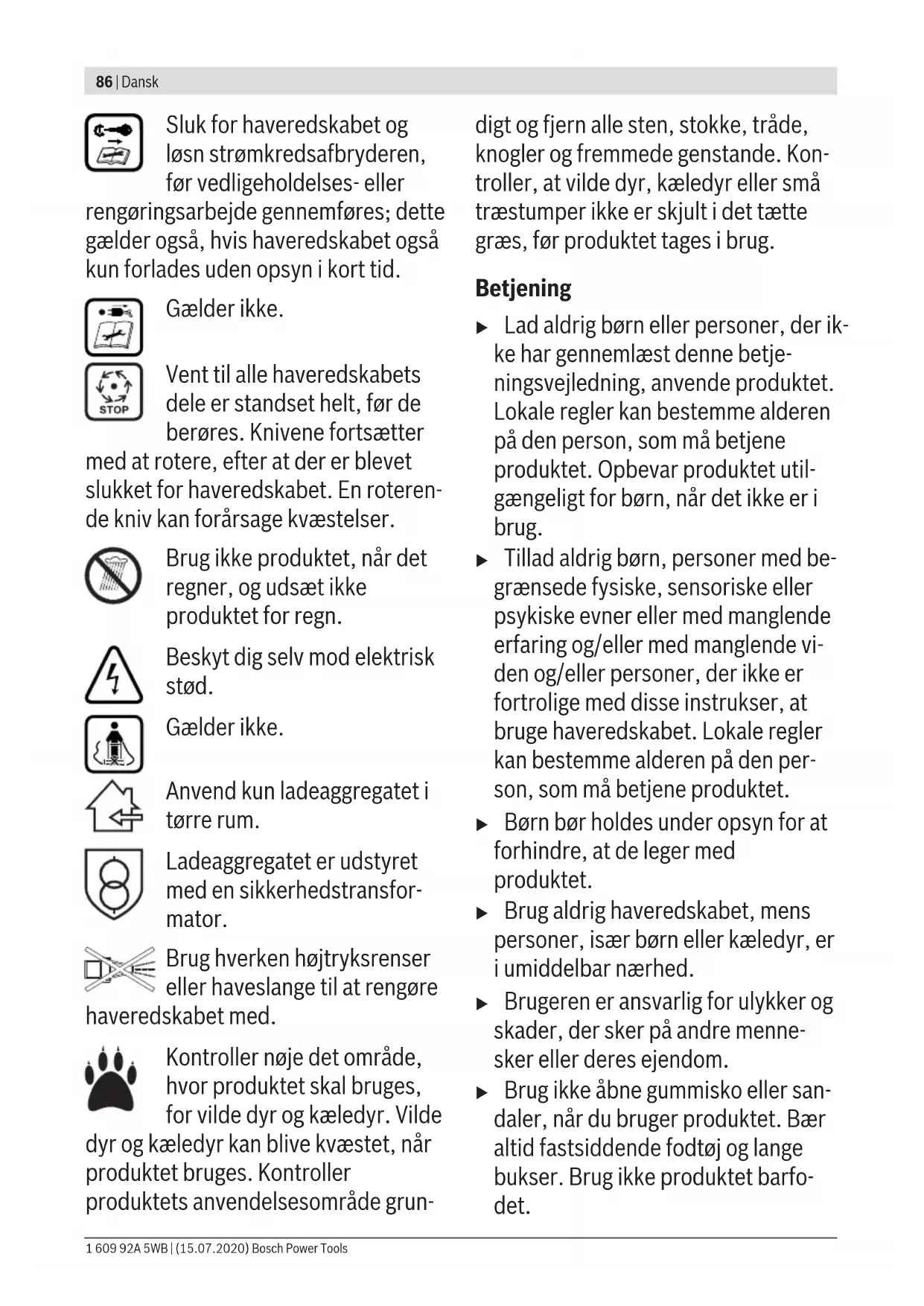 Om de gebruiksduur te verlengen, kunt u via een erkende klantenservice voor Bosch tuingereedschappen een extra accu aanschaffen. Storingen opsporen Symptoom Mogelijke oorzaak Oplossing Motor start niet Interne bekabeling van tuingereedschap defect Neem contact op met de klantenservice van Bosch Accu leeg Laad de accu op Bosch Power Tools 1 609 92A 5WB | (15.07.2020)84 | Nederlands Symptoom Mogelijke oorzaak Oplossing Accu te koud of te heet Accu laten opwarmen of afkoelen Gras te lang Max. toegestane grashoogte is 30cm met de grootste maaihoogte-instelling Motorbeveiliging aangesproken Laat de motor afkoelen en stel een grotere maai- hoogte in Stroomkringonderbreker is niet goed of niet volle- dig ingezet Goed inzetten Tuingereedschap loopt met onderbrekingen Interne bekabeling van tuingereedschap defect Neem contact op met de klantenservice van Bosch Motorbeveiliging aangesproken Laat de motor afkoelen en stel een grotere maai- hoogte in Tuingereedschap laat onregelmatig maai- beeld achter en/of motor werkt moeilijk Maaihoogte te laag Grotere maaihoogte instellen Messen bot Messen vervangen (zie afbeelding K) Verstopping mogelijk Tuingereedschap uitschakelen en stroomkringon- derbreker losmaken Onderzijde van het tuingereedschap controleren en indien nodig vrij maken (draag altijd tuinhand- schoenen) Mes omgekeerd gemonteerd Mes goed monteren Na het inschakelen van het tuingereedschap draait het mes niet Mes wordt gehinderd door gras Tuingereedschap uitschakelen en stroomkringon- derbreker losmaken Verstopping verwijderen (draag altijd tuinhand- schoenen) Moer of schroef van mes los Draai de moer of de schroef van het mes vast (27Nm) Sterke trillingen of ge- luiden Moer of schroef van mes los Draai de moer of de schroef van het mes vast (27Nm) Mes beschadigd Mes vervangen (zie afbeelding K) Accu en oplaadapparaat Symptomen Mogelijke oorzaak Oplossing Rode accuoplaadindi- catie knippert op op- laadapparaat Opladen niet mogelijk Accu niet of niet juist geplaatst Accu juist op oplaadapparaat plaatsen Accucontacten vuil Reinig de accucontacten, bijvoorbeeld door de accu enkele keren te plaatsen en te verwijderen, of vervang de accu indien nodig Accu defect Vervang de accu Accuoplaadindicaties branden niet op het op- laadapparaat Netstekker van het oplaadapparaat niet (of niet goed) vast gestoken Steek de stekker (volledig) in het stopcontact Stopcontact, netsnoer of oplaadapparaat defect Netspanning controleren, oplaadapparaat indien nodig door een erkende klantenservice voor Bosch elektrische gereedschappen laten contro- leren Onderhoud en service Onderhoud van de accu u Let op! Schakel het tuingereedschap uit, maak de stroomkringonderbreker los en verwijder accu en graszak voordat u onderhouds- of reinigingswerk- zaamheden uitvoert. u Draag altijd tuinhandschoenen wanneer u de scherpe messen vastpakt of eraan werkt. Neem de volgende aanwijzingen en maatregelen in acht om een optimaal gebruik van de accu te waarborgen: – Bescherm de accu tegen vocht en water. 1 609 92A 5WB | (15.07.2020) Bosch Power ToolsDansk | 85 – Bewaar het tuingereedschap en de accu alleen in het tem- peratuurbereik tussen –20en 50 °C. Laat de accu bij- voorbeeld in de zomer niet in de auto liggen. – Bewaar de accu apart en niet in het tuingereedschap. – Laat de accu bij fel zonlicht niet in het tuingereedschap zitten. – De optimale temperatuur voor het bewaren van de accu bedraagt 5°C. – Reinig de ventilatieopeningen van de accu af en toe met een zachte, schone en droge kwast. Een duidelijk kortere gebruiksduur na het opladen geeft aan dat de accu versleten is en moet worden vervangen. Klantenservice en gebruiksadvies Onze klantenservice beantwoordt uw vragen over reparatie en onderhoud van uw product en over vervangingsonderde- len. Explosietekeningen en informatie over vervangingson- derdelen vindt u ook op: www.bosch-pt.com Het Bosch-gebruiksadviesteam helpt u graag bij vragen over onze producten en accessoires. Vermeld bij vragen en bestellingen van vervangingsonderde- len altijd het uit tien cijfers bestaande productnummer vol- gens het typeplaatje van het product. Nederland Tel.: (076) 579 54 54 Fax: (076) 579 54 94 E-mail: gereedschappen@nl.bosch.com Meer serviceadressen vindt u onder: www.bosch-pt.com/serviceaddresses Transport Op de meegeleverde Lithium-Ion-accu’s zijn de eisen voor het vervoer van gevaarlijke stoffen van toepassing. De accu’s kunnen door de gebruiker zonder verdere voorwaarden over de weg worden vervoerd. Bij verzending door derden (bijv. luchtvervoer of vervoers- bedrijf) moeten bijzondere eisen ten aanzien van verpakking en markering in acht worden genomen. In deze gevallen moet bij de voorbereiding van de verzending een deskundige voor gevaarlijke goederen worden geraadpleegd. Verzend accu’s alleen als de behuizing onbeschadigd is. Plak blootliggende contacten af en verpak de accu zodanig dat deze niet in de verpakking beweegt. Neem ook eventuele bij- komende nationale voorschriften in acht. Afvalverwijdering Tuingereedschappen, accu’s, toebehoren en verpakkingen moeten op een voor het milieu verantwoorde wijze worden hergebruikt. Gooi tuingereedschappen, accu’s en batterijen niet bij het huisvuil. Alleen voor landen van deEU: Volgens de Europese richtlijn 2012/19/EU moeten niet meer bruikbare elektrische en elektronische apparaten en volgens de Europese richtlijn 2006/66/EG moeten defecte of lege accu’s en batterijen apart worden ingezameld en op een voor het milieu verantwoorde wijze worden hergebruikt. Accu’s en batterijen: Li-ion: Lees de aanwijzingen in het gedeelte Vervoer en neem deze in acht. Dansk Sikkerhedsinstrukser Bemærk! Læs efterfølgende instruk- ser omhyggeligt. Gør dig fortrolig med produktets betjeningsanord- ninger og korrekte anvendelse. Op- bevar betjeningsvejledningen et sik- kert sted til senere brug. Forklaring af symboler på haveredskabet Generel sikkerhedsadvarsel. Læs brugsanvisningen. Pas på, at personer i nærhe- den ikke 