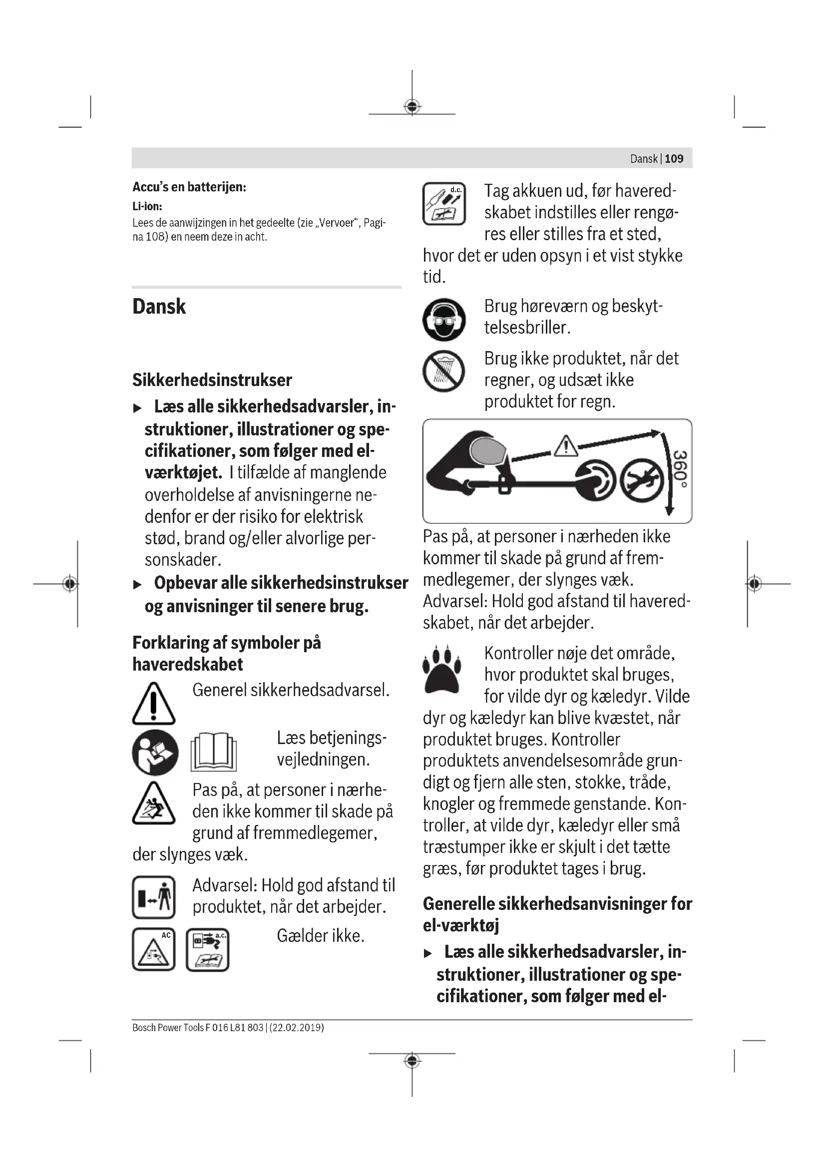 a.c. Gælder ikke. d.c. Tag akkuen ud, før havered- skabet indstilles eller rengø- res eller stilles fra et sted, hvor det er uden opsyn i et vist stykke tid. Brug høreværn og beskyt- telsesbriller. Brug ikke produktet, når det regner, og udsæt ikke produktet for regn. Pas på, at personer i nærheden ikke kommer til skade på grund af frem- medlegemer, der slynges væk. Advarsel: Hold god afstand til havered- skabet, når det arbejder. Kontroller nøje det område, hvor produktet skal bruges, for vilde dyr og kæledyr. Vilde dyr og kæledyr kan blive kvæstet, når produktet bruges. Kontroller produktets anvendelsesområde grun- digt og fjern alle sten, stokke, tråde, knogler og fremmede genstande. Kon- troller, at vilde dyr, kæledyr eller små træstumper ikke er skjult i det tætte græs, før produktet tages i brug. Generelle sikkerhedsanvisninger for el-værktøj u Læs alle sikkerhedsadvarsler, in- struktioner, illustrationer og spe- cifikationer, som følger med el- Bosch Power Tools F 016 L81 803 | (22.02.2019)110 | Dansk værktøjet. I tilfælde af manglende overholdelse af anvisningerne ne- denfor er der risiko for elektrisk stød, brand og/eller alvorlige per- sonskader. u Opbevar alle sikkerhedsinstrukser og anvisninger til senere brug. u Betegnelsen "el-værktøj" i advarsler- ne refererer til dit (ledningsforbund- ne) el-værktøj tilsluttet lysnettet eller til batteridrevet (ledningsfrit) el- værktøj. Sikkerhed på arbejdspladsen u Hold arbejdsområdet rent og godt oplyst. Rodede eller mørke områder kan medføre ulykker. u Brug ikke el‑værktøjet i eksplo- sionsfarlige omgivelser, hvor der findes brændbare væsker, gasser eller støv. El‑værktøj kan slå gnister, der kan antænde støv eller dampe. u Sørg for, at andre personer og ikke mindst børn holdes væk fra ar- bejdsområdet, når el-værktøjet er i brug. Hvis man distraheres, kan man miste kontrollen over maskinen. Elektrisk sikkerhed u El‑værktøjets stik skal passe til kontakten. Stikket må under in- gen omstændigheder ændres. Brug ikke adapterstik sammen med jordforbundet el‑værktøj. Uændrede stik, der passer til kontak- terne, nedsætter risikoen for elek- trisk stød. u Undgå kropskontakt med jordfor- bundne overflader som f. eks. rør, radiatorer, komfurer og køleska- be. Hvis din krop er jordforbundet, øges risikoen for elektrisk stød. u El-værktøj må ikke udsættes for regn eller fugt. Indtrængen af vand i el‑værktøj øger risikoen for elek- trisk stød. u Brug ikke ledningen til formål, den ikke er beregnet til. Du må aldrig bære el‑værktøjet i ledningen, hænge el‑værktøjet op i ledningen eller rykke i ledningen for at træk- ke stikket ud af kontakten. Beskyt ledningen mod varme, olie, skarpe kanter eller maskindele, der er i bevægelse. Beskadigede eller ind- viklede ledninger øger risikoen for elektrisk stød. u Hvis el‑værktøjet benyttes i det fri, må der kun benyttes en forlæn- gerledning, der er egnet til uden- dørs brug. Brug af forlængerledning til udendørs brug nedsætter risikoen for elektrisk stød. u Hvis det ikke kan undgås at bruge el‑værktøjet i fugtige omgivelser, skal der bruges et HFI‑relæ. Brug af et HFI‑relæ reducerer risikoen for at få elektrisk stød. Personlig sikkerhed u Det er vigtigt at være opmærksom og holde øje med, hvad man laver, og bruge el‑værktøjet fornuftigt. Brug ikke el‑værktøj, hvis du er F 016 L81 803 | (22.02.2019) Bosch Power ToolsDansk | 111 træt, har indtaget alkohol eller er påvirket af medikamenter eller eu- foriserende stoffer. Få sekunders uopmærksomhed ved brug af el‑værktøjet kan føre til alvorlige per- sonskader. u Brug personligt beskyttelsesud- styr. Brug altid beskyttelsesbril- ler. Brug af sikkerhedsudstyr som f. eks. støvmaske, skridsikkert fodtøj, beskyttelseshjelm eller høreværn af- hængig af maskintype og anvendelse nedsætter risikoen for per- sonskader. u Undgå utilsigtet igangsætning. Kontrollér, at el‑værktøjet er sluk- ket, før du tilslutter det til strøm- tilførslen og/eller batteriet, løfter eller bærer det. Undgå at bære el‑værktøjet med fingeren på afbry- deren og sørg for, at el‑værktøjet ik- ke er tændt, når det sluttes til nettet, da dette øger risikoen for per- sonskader. u Gør det til en vane altid at fjerne indstillingsværktøj eller skruenøg- le, før el‑værktøjet startes. Hvis et stykke værktøj eller en nøgle sidder i en roterende maskindel, er der risiko for personskader. u Undgå en unormal legemsposi- tion. Sørg for at stå sikkert, mens der arbejdes, og kom ikke ud af ba- lance. Dermed har du bedre mulig- heder for at kontrollere el‑værktøjet, hvis der skulle opstå uventede situa- tioner. u Brug egnet arbejdstøj. Undgå løse beklædningsgenstande eller smykker. Hold hår og tøj væk fra dele, der bevæger sig. Dele, der er i bevægelse, kan gribe fat i løstsid- dende tøj, smykker eller langt hår. u Hvis støvudsugnings- og opsam- lingsudstyr kan monteres, er det vigtigt, at dette tilsluttes og benyt- tes korrekt. Brug af en støvopsug- ning kan reducere støvmængden og dermed den fare, der er forbundet med støv. u Selvom du kender værktøjet godt og er vant til at bruge det, skal du alligevel være opmærksom og overholde sikkerhedsanvisninger- ne. Et øjebliks uopmærksomhed kan medføre alvorlige personskader. Omhyggelig omgang med og brug af el‑værktøj u Undgå overbelastning af el-værk- tøjet. Brug altid el‑værktøj, der er beregnet til det stykke arbejde, der skal udføres. Med det passen- de el‑værktøj arbejder man bedst og mest sikkert inden for det angivne ef- fektområde. u Brug ikke el‑værktøj, hvis afbry- deren er defekt. El‑værktøj, der ik- ke kan startes eller stoppes, er farligt og skal repareres. u Træk stikket ud af stikkontakten og/eller fjern batteriet, hvis det kan tages af, før el-værktøjet ju- steres, før skift af tilbehørsdele 