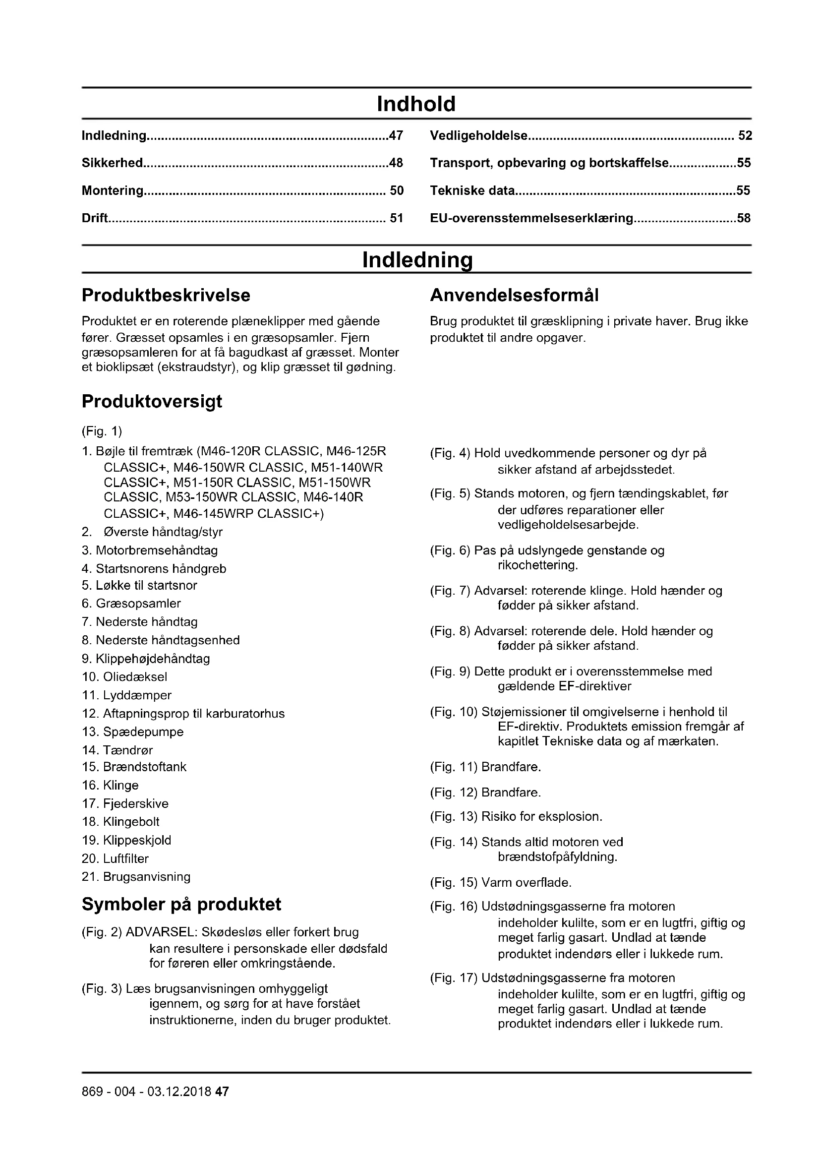 Symboler på produktet (Fig. 2) ADVARSEL: Skødesløs eller forkert brug kan resultere i personskade eller dødsfald for føreren eller omkringstående. (Fig. 3) Læs brugsanvisningen omhyggeligt igennem, og sørg for at have forstået instruktionerne, inden du bruger produktet. (Fig. 4) Hold uvedkommende personer og dyr på sikker afstand af arbejdsstedet. (Fig. 5) Stands motoren, og fjern tændingskablet, før der udføres reparationer eller vedligeholdelsesarbejde. (Fig. 6) Pas på udslyngede genstande og rikochettering. (Fig. 7) Advarsel: roterende klinge. Hold hænder og fødder på sikker afstand. (Fig. 8) Advarsel: roterende dele. Hold hænder og fødder på sikker afstand. (Fig. 9) Dette produkt er i overensstemmelse med gældende EF-direktiver (Fig. 10) Støjemissioner til omgivelserne i henhold til EF-direktiv. Produktets emission fremgår af kapitlet Tekniske data og af mærkaten. (Fig. 11) Brandfare. (Fig. 12) Brandfare. (Fig. 13) Risiko for eksplosion. (Fig. 14) Stands altid motoren ved brændstofpåfyldning. (Fig. 15) Varm overflade. (Fig. 16) Udstødningsgasserne fra motoren indeholder kulilte, som er en lugtfri, giftig og meget farlig gasart. Undlad at tænde produktet indendørs eller i lukkede rum. (Fig. 17) Udstødningsgasserne fra motoren indeholder kulilte, som er en lugtfri, giftig og meget farlig gasart. Undlad at tænde produktet indendørs eller i lukkede rum.