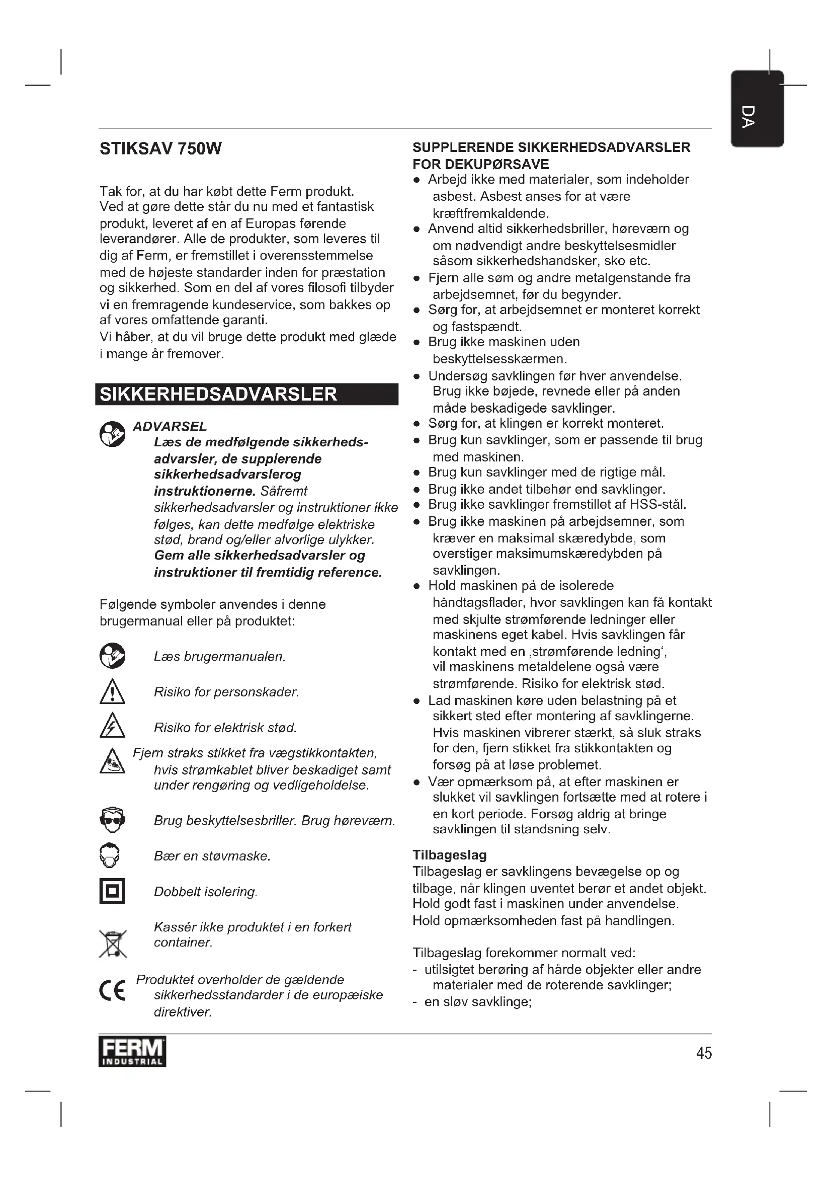 STIKSAV 750W Tak for, at du har købt dette Ferm produkt. Ved at gøre dette står du nu med et fantastisk produkt, leveret af en af Europas førende leverandører. Alle de produkter, som leveres til dig af Ferm, er fremstillet i overensstemmelse med de højeste standarder inden for præstation og sikkerhed. Som en del af vores loso tilbyder vi en fremragende kundeservice, som bakkes op af vores omfattende garanti. Vi håber, at du vil bruge dette produkt med glæde i mange år fremover. SIKKERHEDSADVARSLER
