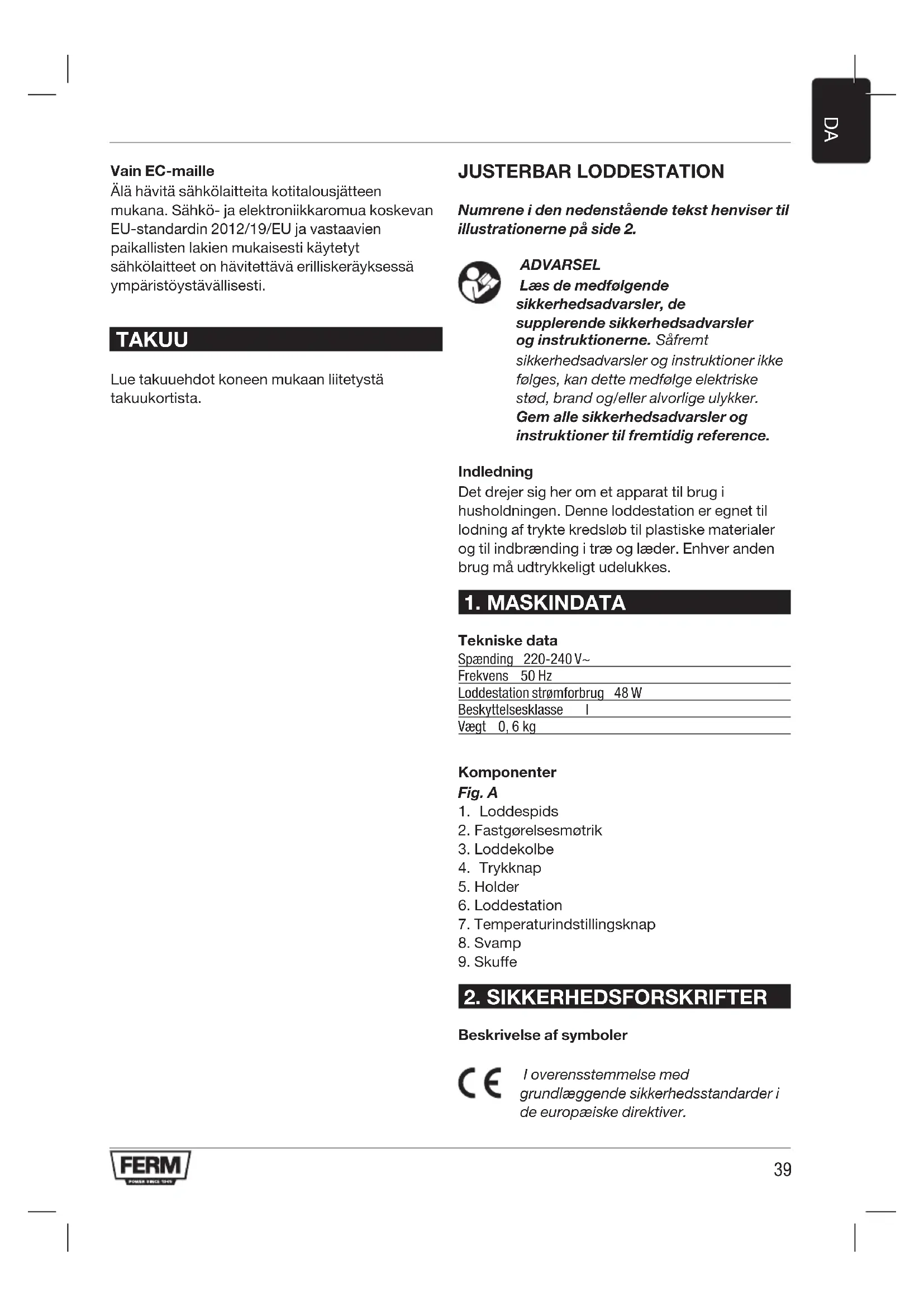 Tekniske data Spænding 220-240 V~ Frekvens 50 Hz Loddestation strømforbrug 48 W Beskyttelsesklasse I Vægt 0, 6 kg Komponenter Fig. A