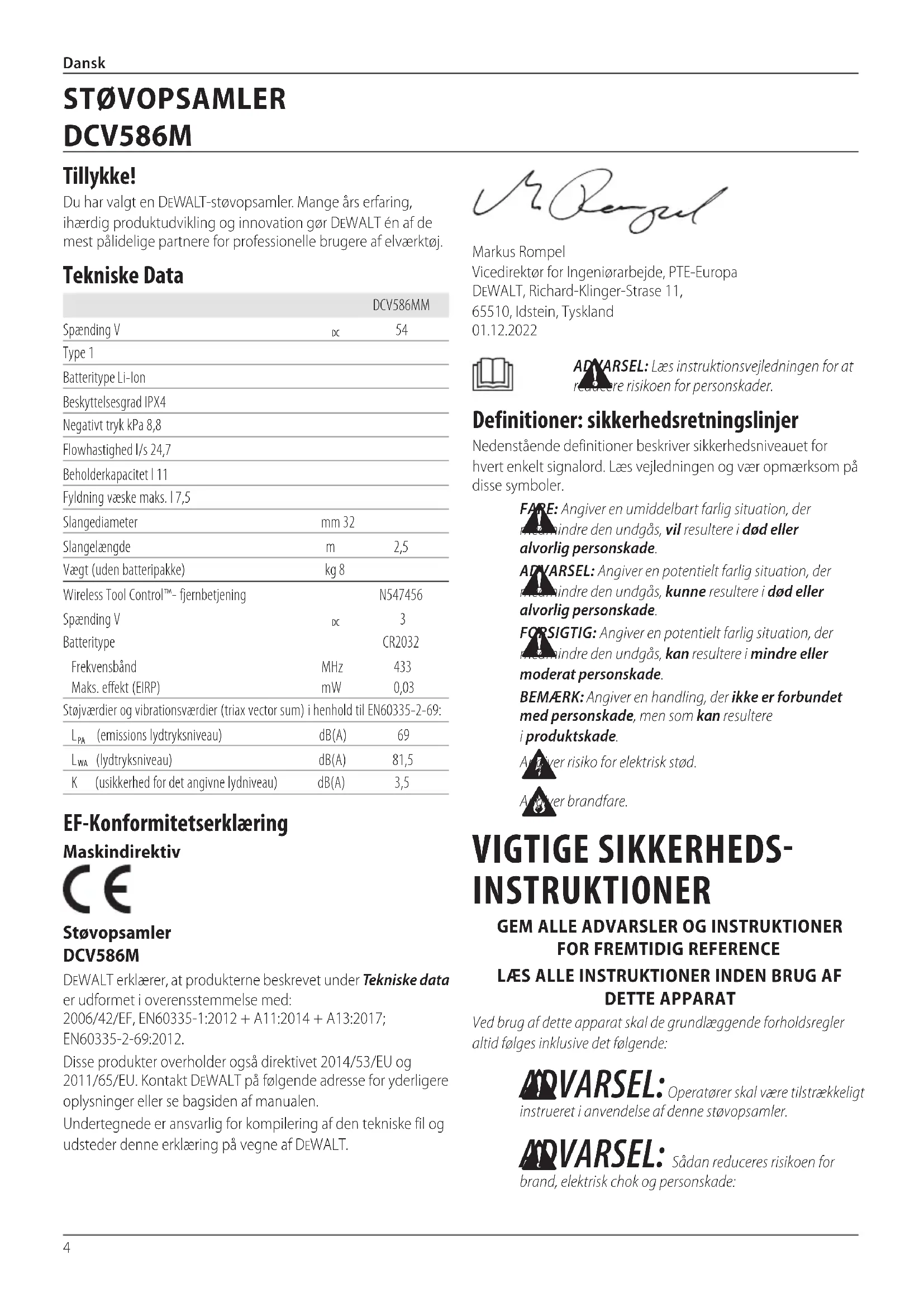 (lydtryksniveau) dB(A) 81,5 K (usikkerhed for det angivne lydniveau) dB(A) 3,5 EF‑Konformitetserklæring Maskindirektiv Støvopsamler DCV586M DeWALT erklærer, at produkterne beskrevet under Tekniske data er udformet i overensstemmelse med: 2006/42/EF, EN60335‑1:2012 + A11:2014 + A13:2017; EN60335‑2‑69:2012.Disse produkter overholder også direktivet 2014/53/EU og 2011/65/EU. Kontakt DeWALT på følgende adresse for yderligere oplysninger eller se bagsiden afmanualen.Undertegnede er ansvarlig for kompilering af den tekniske fil og udsteder denne erklæring på vegne afDeWALT. STØVOPSAMLER DCV586M Dansk (oversat fra original brugsvejledning)5 Dansk