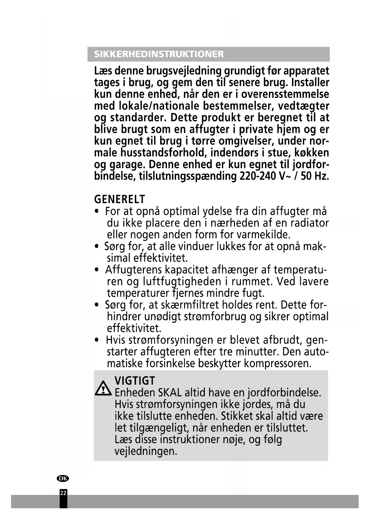 - Hvis strømforsyningen er blevet afbrudt, gen- starter affugteren efter tre minutter. Den auto- matiske forsinkelse beskytter kompressoren. VIGTIGT Enheden SKAL altid have en jordforbindelse. Hvis strømforsyningen ikke jordes, må du ikke tilslutte enheden. Stikket skal altid være let tilgængeligt, når enheden er tilsluttet. Læs disse instruktioner nøje, og følg vejledningen.
