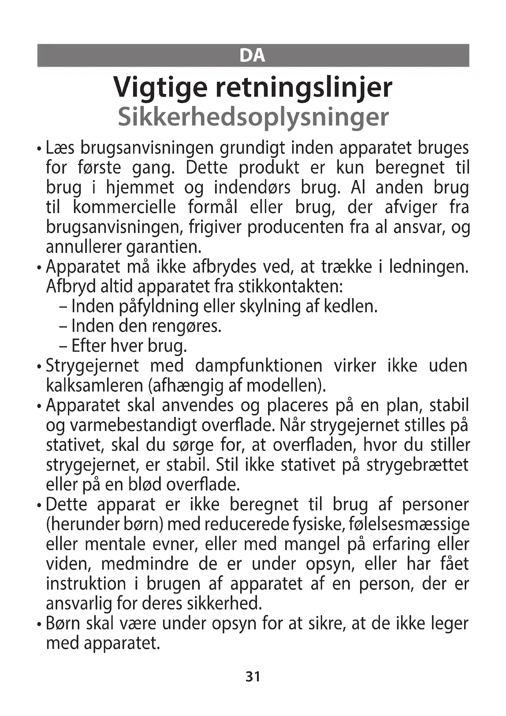 - Dette apparat må bruges af børn i alderen 8 år og ældre og af personer uden erfaring eller viden, eller med nedsatte fysiske, følelsesmæssige eller mentale evner, hvis de er blevet instrueret i hvordan apparatet bruges sikkert, er under tilsyn og forstår de involverede risici. Børn må ikke lege med apparatet. Børn må ikke rengøre eller pleje apparatet uden opsyn. Hold strygejernet og dets ledning utilgængeligt for børn under 8 år, når strygejernet er tændt, og når det køler ned.