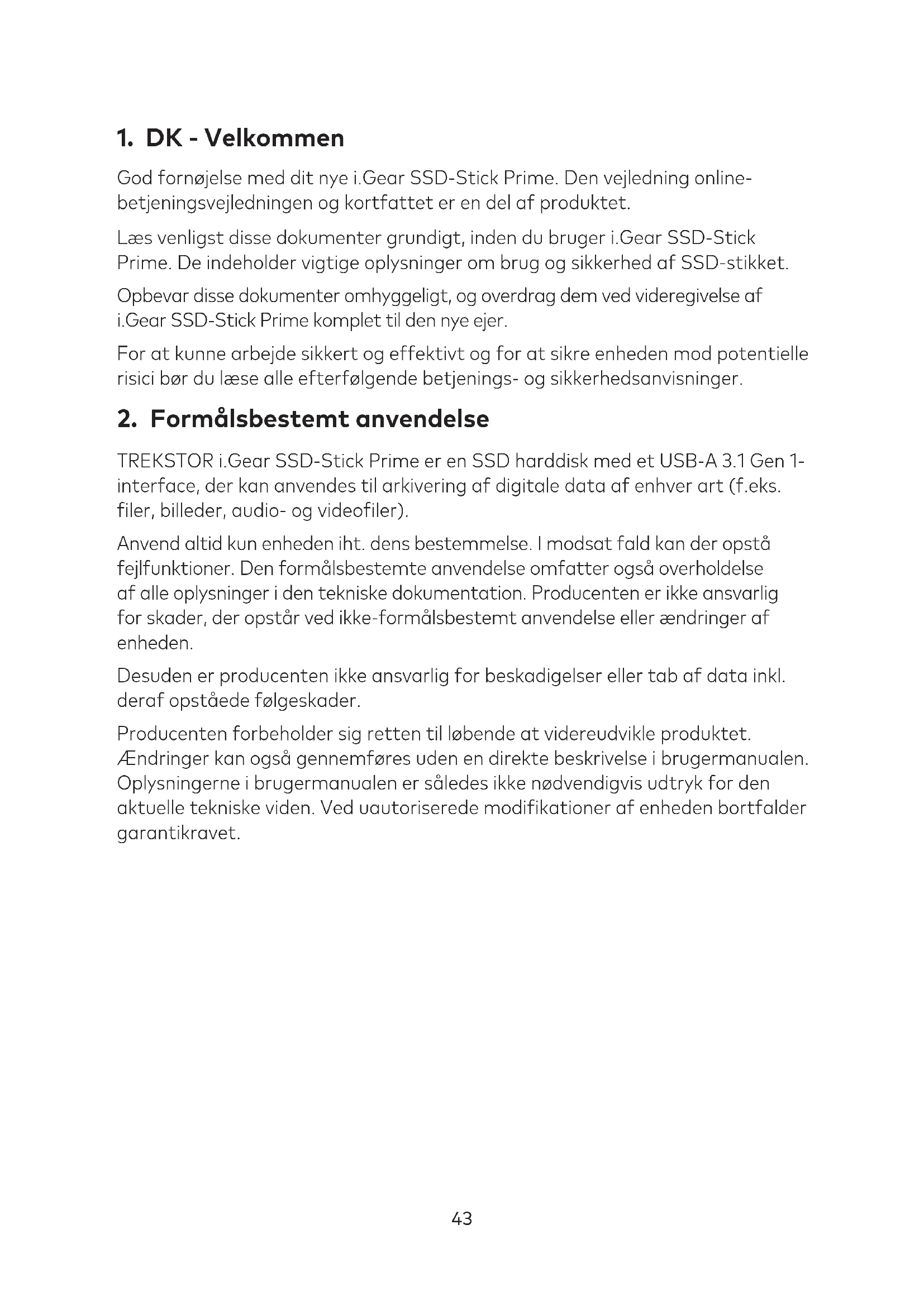 TREKSTOR i.Gear SSD-Stick Prime er en SSD harddisk med et USB-A 3.1 Gen 1- interface, der kan anvendes til arkivering af digitale data af enhver art (f.eks. iler, billeder, audio- og videoiler). Anvend altid kun enheden iht. dens bestemmelse. I modsat fald kan der opstå fejlfunktioner. Den formålsbestemte anvendelse omfatter også overholdelse af alle oplysninger i den tekniske dokumentation. Producenten er ikke ansvarlig for skader, der opstår ved ikke-formålsbestemt anvendelse eller ændringer af enheden. Desuden er producenten ikke ansvarlig for beskadigelser eller tab af data inkl. deraf opståede følgeskader. Producenten forbeholder sig retten til løbende at videreudvikle produktet. Ændringer kan også gennemføres uden en direkte beskrivelse i brugermanualen. Oplysningerne i brugermanualen er således ikke nødvendigvis udtryk for den aktuelle tekniske viden. Ved uautoriserede modiikationer af enheden bortfalder garantikravet.44