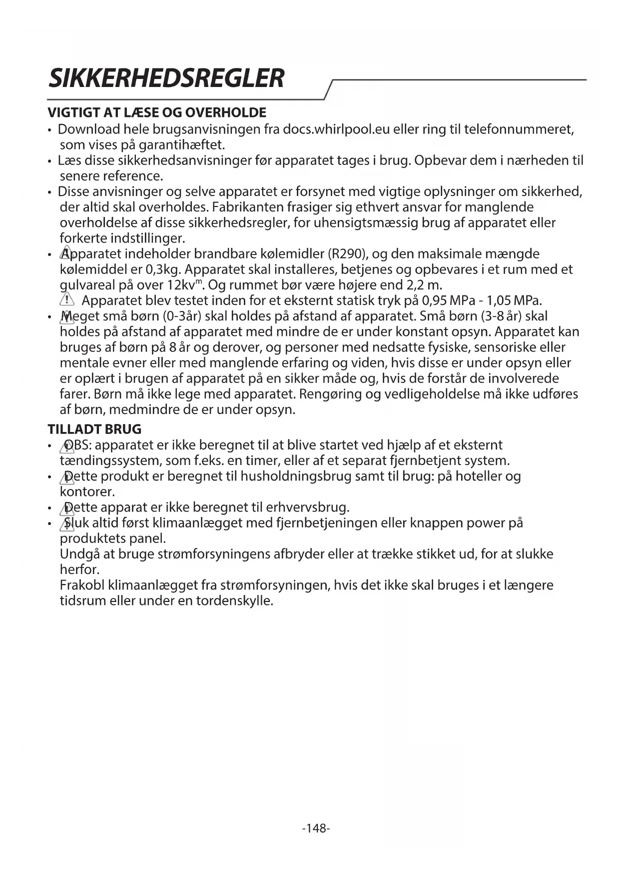 - Temperaturen udenfor er lavere end 18°C. Forsøg aldrig på at bruge dit klimaanlæg i afkølingstilstanden, hvis temperaturen udenfor er lavere end 18°C. Bemærk: Sluk for apparatet og kobl det fra strømforsyningen, hvis problemerne varer ved, og kontakt herefter det nærmeste autoriserede Whirlpool-servicecenter. Forsøg aldrig på at flytte, reparere, demontere eller modificere apparatet på egen hånd.-163- SERVICEAFDELING Før du kontakter Service: