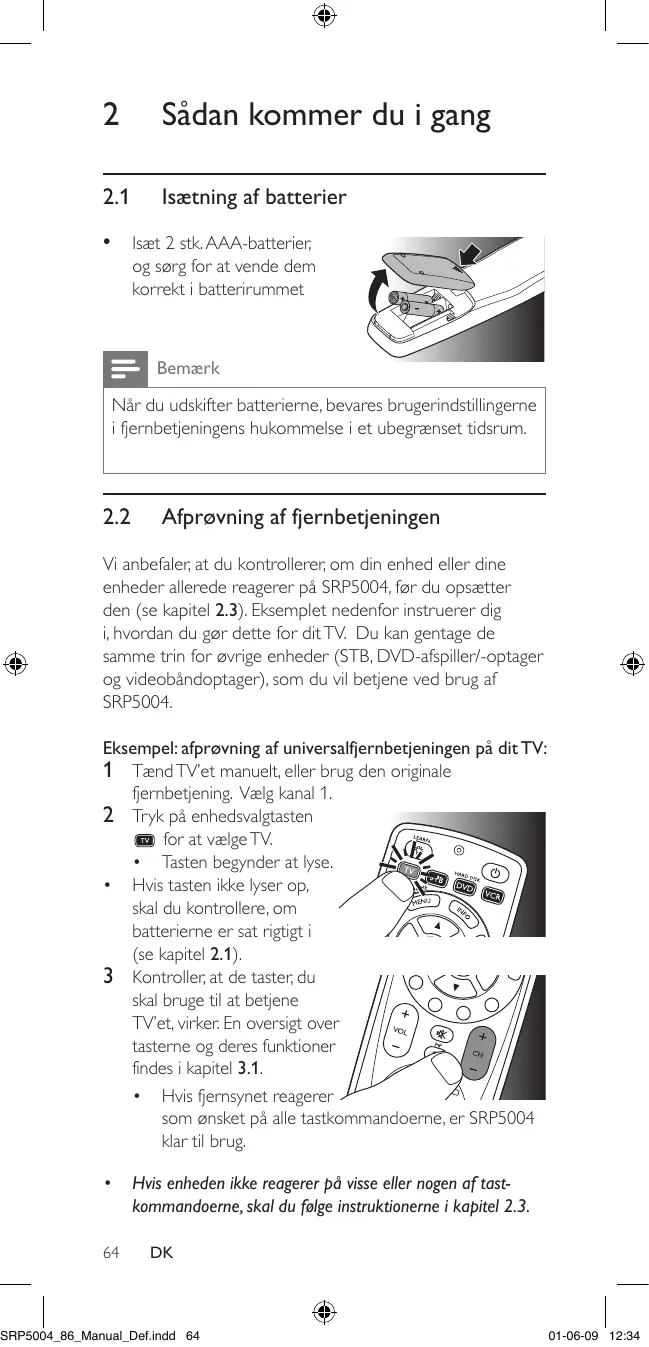 - Hvis tasten stadig ikke fungerer som forventet, kan du prøve at trykke på den i længere tid. Efter den første opsætning 1 Sørg for, at modtagerenheden er i stand til at reagere. Hvis du f.eks. reparerer afpilningsknappen til din DVDafspiller, skal du sørge for at indsætte en DVD i DVD- SRP5004_86_Manual_Def.indd 67