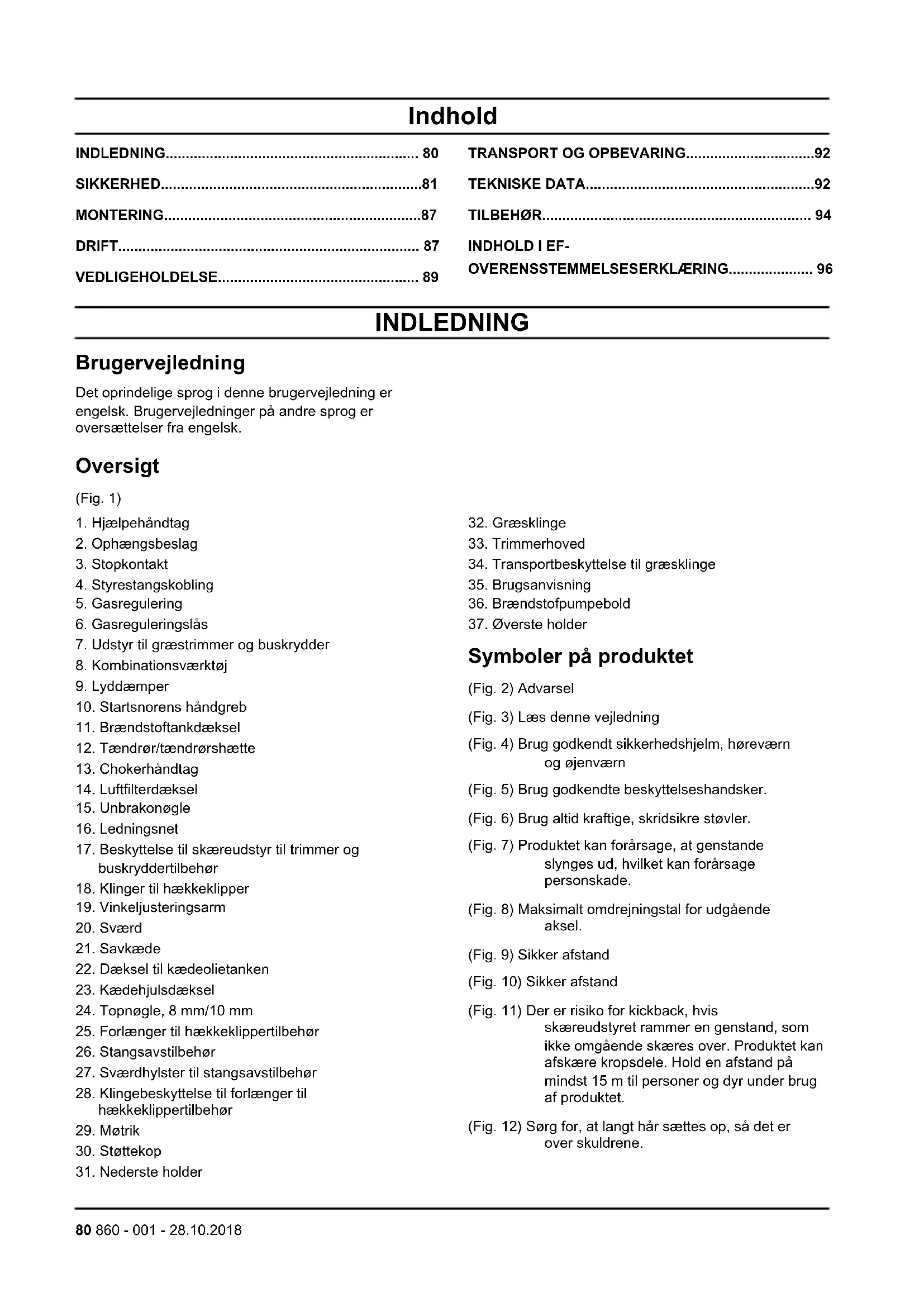 Symboler på produktet (Fig. 2) Advarsel (Fig. 3) Læs denne vejledning (Fig. 4) Brug godkendt sikkerhedshjelm, høreværn og øjenværn (Fig. 5) Brug godkendte beskyttelseshandsker. (Fig. 6) Brug altid kraftige, skridsikre støvler. (Fig. 7) Produktet kan forårsage, at genstande slynges ud, hvilket kan forårsage personskade. (Fig. 8) Maksimalt omdrejningstal for udgående aksel. (Fig. 9) Sikker afstand (Fig. 10) Sikker afstand (Fig. 11) Der er risiko for kickback, hvis skæreudstyret rammer en genstand, som ikke omgående skæres over. Produktet kan afskære kropsdele. Hold en afstand på mindst 15 m til personer og dyr under brug af produktet. (Fig. 12) Sørg for, at langt hår sættes op, så det er over skuldrene. 80 860 - 001 - 28.10.2018(Fig. 13) Pilene viser grænserne for håndtagets position. (Fig. 14) Spædepumpe (Fig. 15) Chokerhåndtag (Fig. 16) Hold alle dele af kroppen på sikker afstand af varme overflader. (Fig. 17) Sørg for, at der ikke befinder sig personer inden for kastfarezonen. (Fig. 18) FARE ‐ Hold hænderne væk fra klingen. (Fig. 19) Lydeffektniveau (Fig. 20) Produktet er i overensstemmelse med gældende EF-direktiver. (Fig. 21) Produktet er i overensstemmelse med gældende EAC-direktiver. (Fig. 22) Produktet er i overensstemmelse med gældende ukrainske direktiver. Bemærk: Andre symboler/mærkater på produktet henviser til certificeringskrav i andre handelsområder. EU V ADVARSEL: Ved manipulation af motoren bortfalder EU-typegodkendelsen af dette produkt. Produktansvar Som nævnt i produktansvarsbestemmelserne hæfter vi ikke for skader forårsaget af vores produkt, hvis: