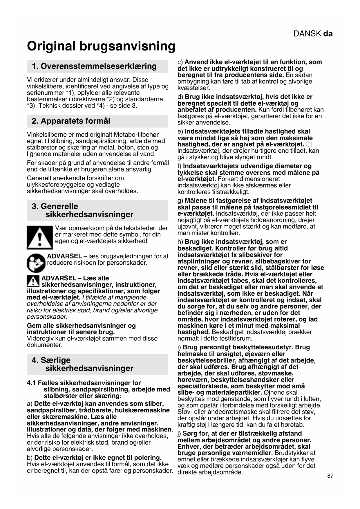 Original brugsanvisning Vi erklærer under almindeligt ansvar: Disse vinkelslibere, identificeret ved angivelse af type og serienummer *1), opfylder alle relevante bestemmelser i direktiverne *2) og standarderne *3). Teknisk dossier ved *4) - se side 3. Vinkelsliberne er med originalt Metabo-tilbehør egnet til slibning, sandpapirslibning, arbejde med stålbørster og skæring af metal, beton, sten og lignende materialer uden anvendelse af vand. For skader på grund af anvendelse til andre formål end de tiltænkte er brugeren alene ansvarlig. Generelt anerkendte forskrifter om ulykkesforebyggelse og vedlagte sikkerhedsanvisninger skal overholdes. Vær opmærksom på de tekststeder, der er markeret med dette symbol, for din egen og el-værktøjets sikkerhed! ADVARSEL – læs brugsvejledningen for at reducere risikoen for personskader. ADVARSEL – Læs alle sikkerhedsanvisninger, instruktioner, illustrationer og specifikationer, som følger med el-værktøjet. I tilfælde af manglende overholdelse af anvisningerne nedenfor er der risiko for elektrisk stød, brand og/eller alvorlige personskader. Gem alle sikkerhedsanvisninger og instruktioner til senere brug. Videregiv kun el-værktøjet sammen med disse dokumenter.