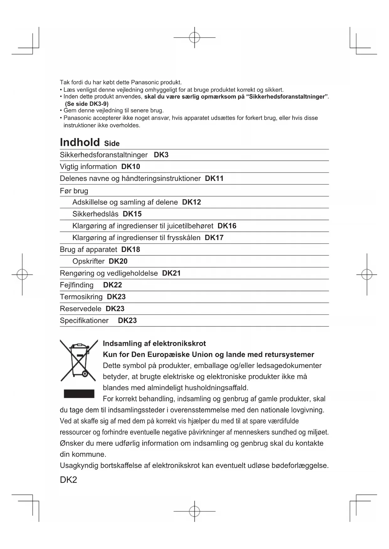 Gemdenvejledningtil senerebrug. - Panasonic accepter er ikke noget ansvar, hvis apparatet udsættes for forkert brug, eller hvis disse instruktioner ikke overholds.