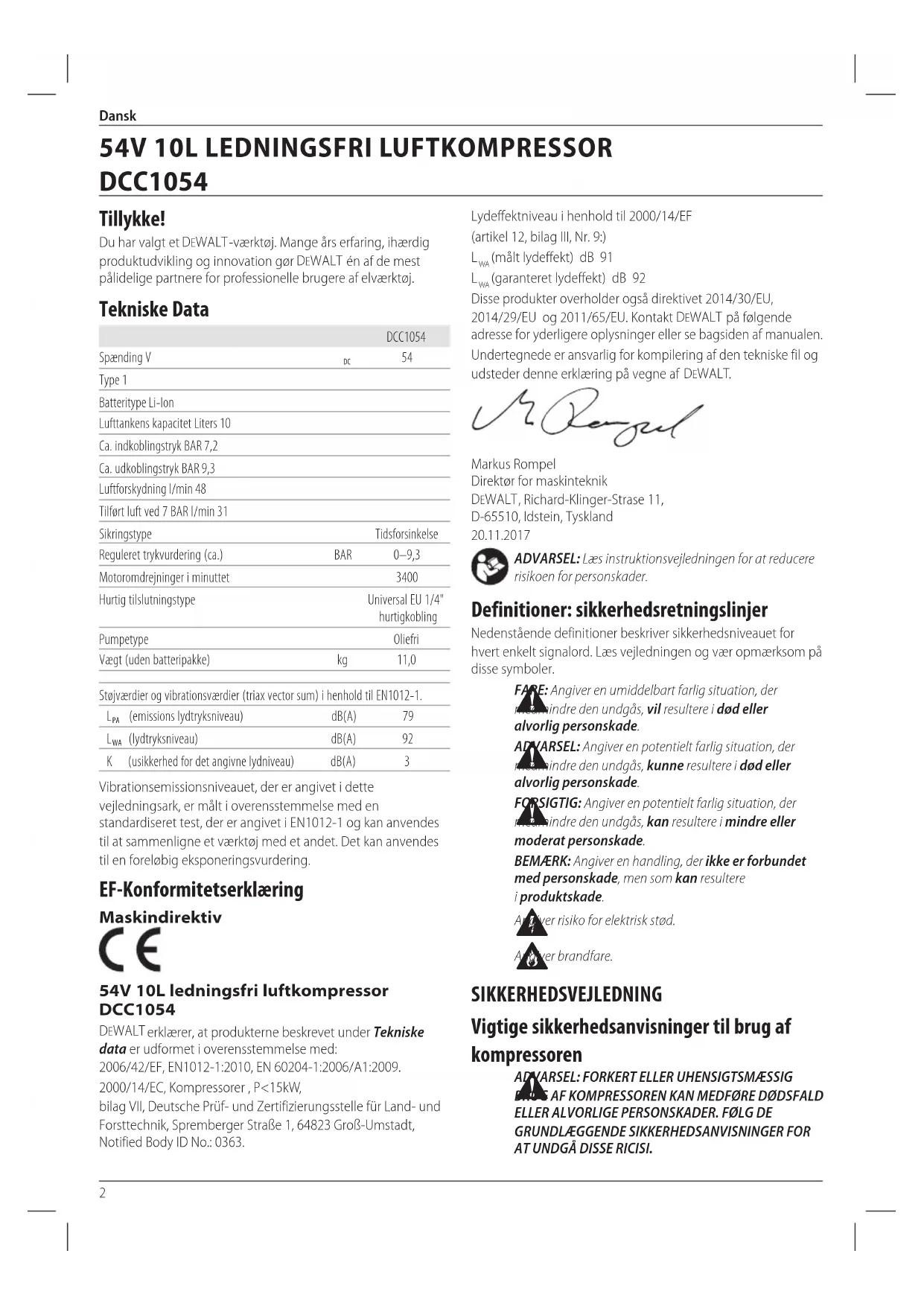 (lydtryksniveau) dB(A) 92 K (usikkerhed for det angivne lydniveau) dB(A) 3 Vibrationsemissionsniveauet, der er angivet i dette vejledningsark, er målt i overensstemmelse med en standardiseret test, der er angivet i EN1012‑1 og kan anvendes til at sammenligne et værktøj med et andet. Det kan anvendes til en foreløbigeksponeringsvurdering. EF‑Konformitetserklæring Maskindirektiv 54V 10L ledningsfri luftkompressor DCC1054 DeWALT erklærer, at produkterne beskrevet under Tekniske data er udformet i overensstemmelse med: 2006/42/EF, EN1012‑1:2010, EN 60204‑1:2006/A1:2009. 2000/14/EC, Kompressorer , P<15kW, bilag VII, Deutsche Prüf‑ und Zertifizierungsstelle für Land‑ und Forsttechnik, Spremberger Straße 1, 64823 Groß‑Umstadt, Notified Body ID No.:0363.