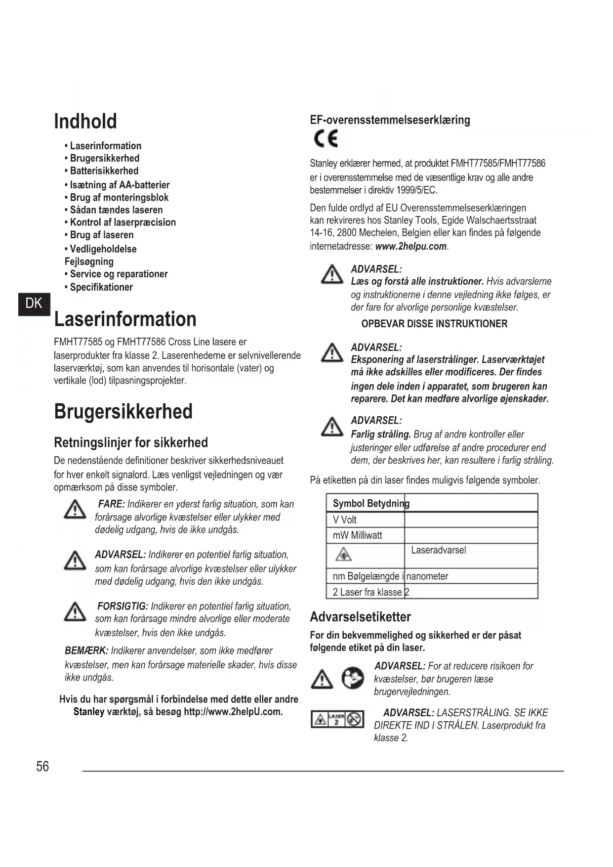 ADVARSEL: Eksponering af laserstrålinger. Laserværktøjet må ikke adskilles eller modiceres. Der ndes ingen dele inden i apparatet, som brugeren kan reparere. Det kan medføre alvorlige øjenskader. ADVARSEL: Farlig stråling. Brug af andre kontroller eller justeringer eller udførelse af andre procedurer end dem, der beskrives her, kan resultere i farlig stråling. På etiketten på din laser ndes muligvis følgende symboler. Symbol Betydning V Volt mW Milliwatt Laseradvarsel nm Bølgelængde i nanometer 2 Laser fra klasse 2 Advarselsetiketter For din bekvemmelighed og sikkerhed er der påsat følgende etiket på din laser. ADVARSEL: For at reducere risikoen for kvæstelser, bør brugeren læse brugervejledningen.