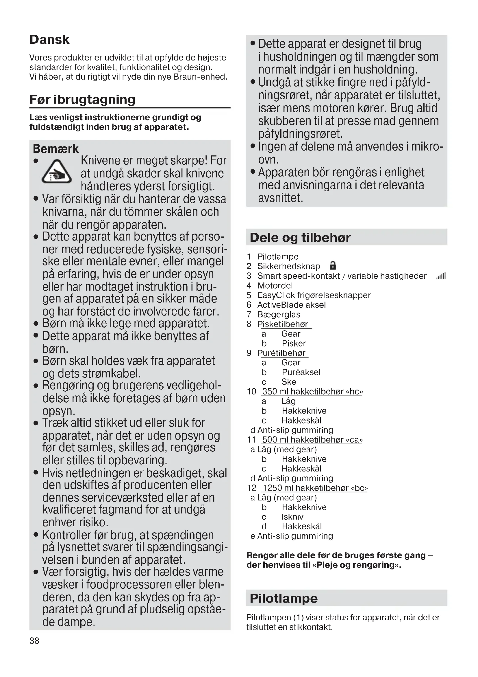 Apparaten bör rengöras i enlighet med anvisningarna i det relevanta avsnittet. Dele og tilbehør 1 Pilotlampe 2 Sikkerhedsknap 3 Smart speed-kontakt / variable hastigheder 4 Motordel 5 EasyClick frigørelsesknapper 6 ActiveBlade aksel 7 Bægerglas 8 Pisketilbehør a Gear b Pisker 9 Purétilbehør a Gear b Puréaksel c Ske 10 350 ml hakketilbehør «hc» a Låg b Hakkeknive c Hakkeskål d Anti-slip gummiring 11 500 ml hakketilbehør «ca» a Låg (med gear) b Hakkeknive c Hakkeskål d Anti-slip gummiring 12 1250 ml hakketilbehør «bc» a Låg (med gear) b Hakkeknive c Iskniv d Hakkeskål e Anti-slip gummiring Rengør alle dele før de bruges første gang – der henvises til «Pleje og rengøring». Pilotlampe Pilotlampen (1) viser status for apparatet, når det er tilsluttet en stikkontakt. 5722112414_MQ9045X_INT_S6-116.indd 38 17.10.16 11:2139 Pilotlampe Apparat / funktionsstatus Rødt blink Apparatet er klar til brug. Lyser grønt hele tiden Apparatet er startklart (frigørelse- skontakten er trykket), og det kan tændes Lyser rødt hele tiden Tidlig advarsel om overophed- ning. Motoren går ned i hastig- hed, trin for trin, indtil den slukker. Lad enheden køle af. Den er klar til brug igen, når pilotlampen blinker rødt. Hvis den maksimale hastighed falder under høj belastning og en lang køretid, kan du stadig afslutte din tilberedning, men du skal lade apparatet køle ned bagefter. Sådan bruges apparatet Smart speed-kontakt til variable hastigheder Et tryk, alle hastigheder. Jo mere der trykkes, jo højere hastighed. Jo højere hastighed, jo hurtigere og finere blande- og snitteresultater. Enhåndsbetjening: Smart speed-kontakten (3) gør det muligt at tænde for apparatet og kontrollere hastigheden med én hånd. Betjening af håndblenderen Første brug: Fjern transportlåsen fra motordelen (4) ved at trække i den på den røde rem. Tænd (A) Apparatet er udstyret med en sikkerhedsknap til aktivering af Smart speed-kontakten. For en sikker opstart, skal disse punkter følges: