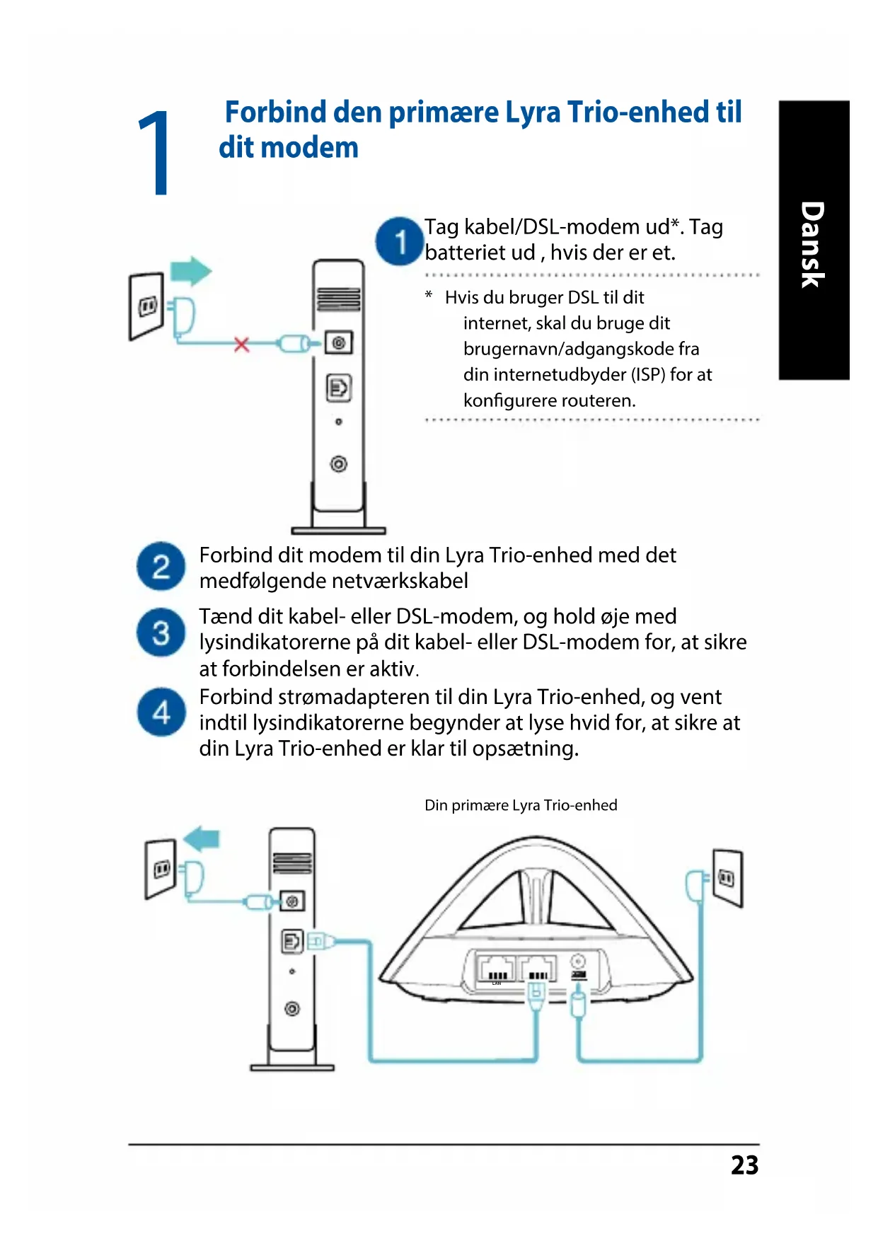 - Hvis du bruger DSL til dit internet, skal du bruge dit brugernavn/adgangskode fra din internetudbyder (ISP) for at kongurere routeren. Tænd dit kabel- eller DSL-modem, og hold øje med lysindikatorerne på dit kabel- eller DSL-modem for, at sikre at forbindelsen er aktiv. Forbind strømadapteren til din Lyra Trio-enhed, og vent indtil lysindikatorerne begynder at lyse hvid for, at sikre at din Lyra Trio-enhed er klar til opsætning. Din primære Lyra Trio-enhed 1Dansk