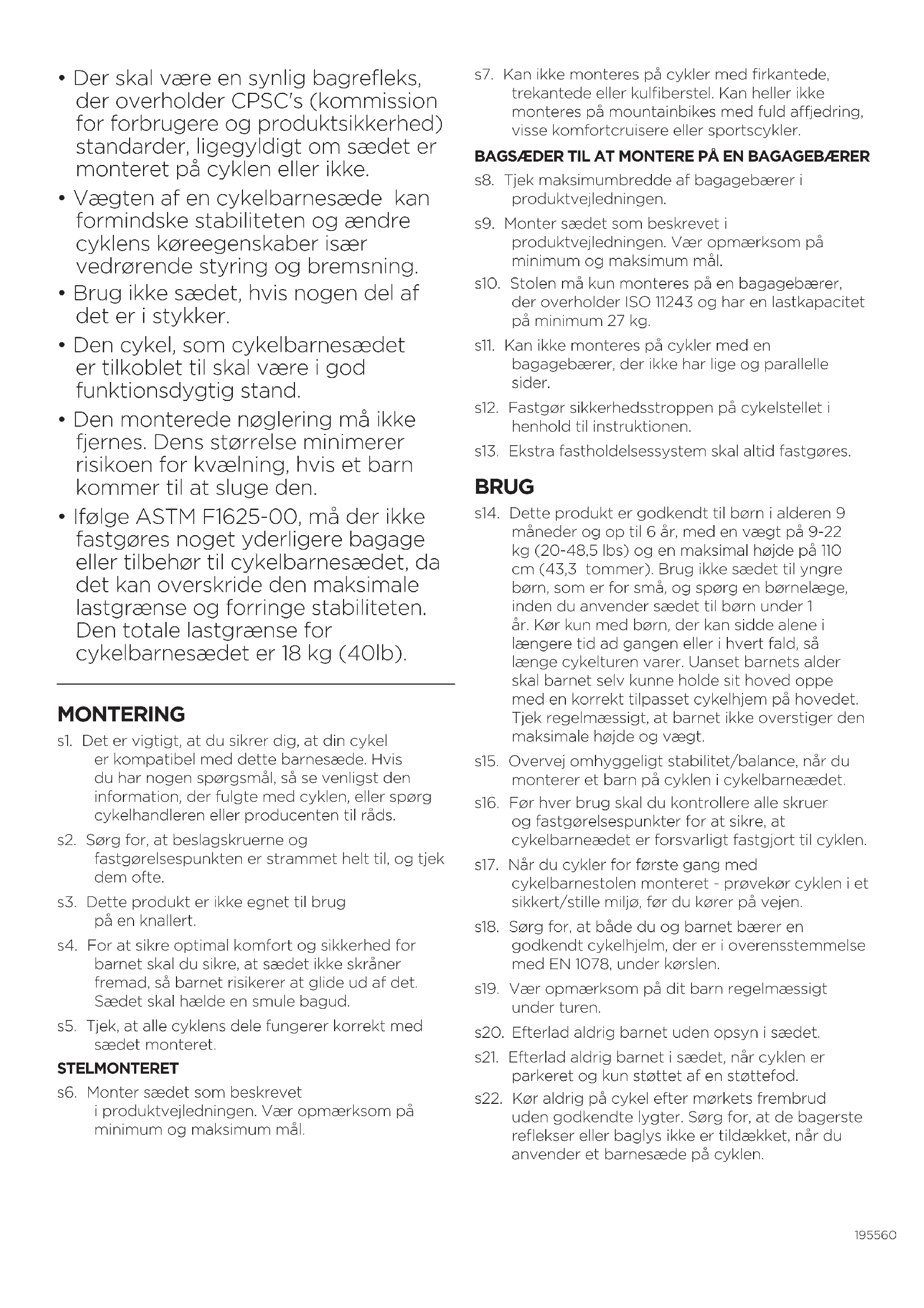 s7. Kan ikke monteres på cykler med firkantede, trekantede eller kulfiberstel. Kan heller ikke monteres på mountainbikes med fuld ajedring, visse komfortcruisere eller sportscykler. BAGSÆDER TIL AT MONTERE PÅ ENBAGAGEBÆRER s8. Tjek maksimumbredde af bagagebærer i produktvejledningen. s9. Monter sædet som beskrevet i produktvejledningen. Vær opmærksom på minimum og maksimum mål. s10. Stolen må kun monteres på en bagagebærer, der overholder ISO 11243 og har en lastkapacitet på minimum 27kg. s11. Kan ikke monteres på cykler med en bagagebærer, der ikke har lige og parallelle sider. s12. Fastgør sikkerhedsstroppen på cykelstellet i henhold til instruktionen. s13. Ekstra fastholdelsessystem skal altid fastgøres. BRUG s14. Dette produkt er godkendt til børn i alderen 9 måneder og op til 6 år, med en vægt på 9-22 kg (20-48,5 lbs) og en maksimal højde på 110 cm (43,3 tommer). Brug ikke sædet til yngre børn, som er for små, og spørg en børnelæge, inden du anvender sædet til børn under 1 år. Kør kun med børn, der kan sidde alene i længere tid ad gangen eller i hvert fald, så længe cykelturen varer. Uanset barnets alder skal barnet selv kunne holde sit hoved oppe med en korrekt tilpasset cykelhjem på hovedet. Tjek regelmæssigt, at barnet ikke overstiger den maksimale højde og vægt. s15. Overvej omhyggeligt stabilitet/balance, når du monterer et barn på cyklen icykelbarneædet. s16. Før hver brug skal du kontrollere alle skruer og fastgørelsespunkter for at sikre, at cykelbarneædet er forsvarligt fastgjort til cyklen. s17. Når du cykler for første gang med cykelbarnestolen monteret - prøvekør cyklen i et sikkert/stille miljø, før du kører på vejen. s18. Sørg for, at både du og barnet bærer en godkendt cykelhjelm, der er ioverensstemmelse med EN 1078, under kørslen. s19. Vær opmærksom på dit barn regelmæssigt under turen. s20. Efterlad aldrig barnet uden opsyn isædet. s21. Efterlad aldrig barnet i sædet, når cyklen er parkeret og kun støttet af en støttefod. s22. Kør aldrig på cykel efter mørkets frembrud uden godkendte lygter. Sørg for, at de bagerste reflekser eller baglys ikke er tildækket, når du anvender et barnesæde på cyklen.20 5560140001 s23. Tilstedeværelsen af et barnesæde kan kræve, at du ændrer den måde, du stiger af og på cyklen. Vær venligst opmærksom på dette. s24. Inden du kører af sted, skal du hver gang sikre, at barnesædet ikke kommer i vejen for bremser, pedaler eller styr. s25. Brug altid selen, og sørg for, at den er korrekt fastgjort omkring barnet. Sørg for, at selen og fodremmene ikke er løse eller kan komme i klemme i bevægelige dele såsom hjulene. Dette gælder også, når du anvender cyklen uden et barn isædet. s26. Sørg for, at barnets tøj, sko, legetøj eller kropsdele ikke kommer i kontakt med nogen af cyklens bevægelige dele, såsom hjul, kabler og sadelfjedre. Tjek dette regelmæssigt, efterhånden som barnet vokser. Sadelfjedre kan eventuelt dækkes med en passende fjederbeskyttelse. s27. Sørg for, at der ikke er nogen skarpe genstande inden for barnets rækkevidde, som fx flossede kabler. s28. Barnet i barnesædet har ofte brug for at være varmere klædt på end cyklens fører. For at beskytte jer begge mod uventet regn er vandtæt beklædning en god ide. Kør aldrig under barske eller farlige forhold, såsom kraftig frost, der vil kunne forårsage, at barnet får forfrysninger. s29. Tjek barnesædets temperatur, inden du sætter barnet i det, særligt på varme, solrige dage. s30. Fjern cykelbarnesædet, når du transporterer cyklen på en bil. Vinden kan forårsage skader på cykelbarnesædet eller rive det løs fra cyklen, hvilket kan resultere i en ulykke. s31. Tjek inden anvendelse, om der ernogen nationale love eller regler, der gælder specielt for transport af børn på cykelsæder. s32. Producenten er ikke ansvarlig for skader, der måtte opstå som følge afanvendelse ud over den anvendelse, der anbefales i denne vejledning. VEDLIGEHOLDELSE s33. Sædet rengøres med lunkent sæbevand. s34. Kontakt venligst din nærmeste Thule-forhandler, hvis nogen del af cykelbarnesædet er beskadiget eller ødelagt.