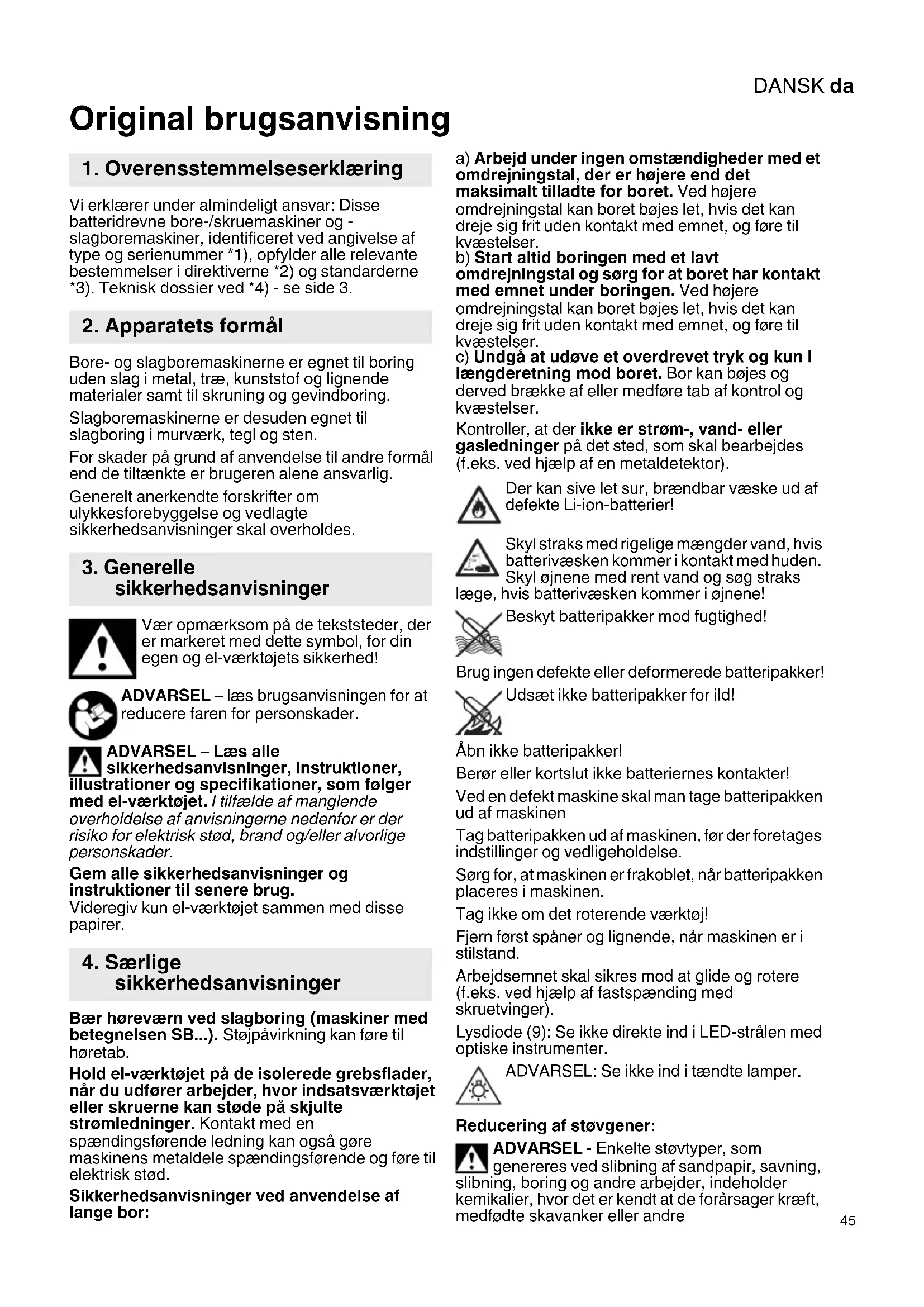 Original brugsanvisning Vi erklærer under almindeligt ansvar: Disse batteridrevne bore-/skruemaskiner og - slagboremaskiner, identificeret ved angivelse af type og serienummer *1), opfylder alle relevante bestemmelser i direktiverne *2) og standarderne *3). Teknisk dossier ved *4) - se side 3. Bore- og slagboremaskinerne er egnet til boring uden slag i metal, træ, kunststof og lignende materialer samt til skruning og gevindboring. Slagboremaskinerne er desuden egnet til slagboring i murværk, tegl og sten. For skader på grund af anvendelse til andre formål end de tiltænkte er brugeren alene ansvarlig. Generelt anerkendte forskrifter om ulykkesforebyggelse og vedlagte sikkerhedsanvisninger skal overholdes. Vær opmærksom på de tekststeder, der er markeret med dette symbol, for din egen og el-værktøjets sikkerhed! ADVARSEL – læs brugsanvisningen for at reducere faren for personskader. ADVARSEL – Læs alle sikkerhedsanvisninger, instruktioner, illustrationer og specifikationer, som følger med el-værktøjet. I tilfælde af manglende overholdelse af anvisningerne nedenfor er der risiko for elektrisk stød, brand og/eller alvorlige personskader. Gem alle sikkerhedsanvisninger og instruktioner til senere brug. Videregiv kun el-værktøjet sammen med disse papirer. Bær høreværn ved slagboring (maskiner med betegnelsen SB...). Støjpåvirkning kan føre til høretab. Hold el-værktøjet på de isolerede grebsflader, når du udfører arbejder, hvor indsatsværktøjet eller skruerne kan støde på skjulte strømledninger. Kontakt med en spændingsførende ledning kan også gøre maskinens metaldele spændingsførende og føre til elektrisk stød. Sikkerhedsanvisninger ved anvendelse af lange bor: a) Arbejd under ingen omstændigheder med et omdrejningstal, der er højere end det maksimalt tilladte for boret. Ved højere omdrejningstal kan boret bøjes let, hvis det kan dreje sig frit uden kontakt med emnet, og føre til kvæstelser. b) Start altid boringen med et lavt omdrejningstal og sørg for at boret har kontakt med emnet under boringen. Ved højere omdrejningstal kan boret bøjes let, hvis det kan dreje sig frit uden kontakt med emnet, og føre til kvæstelser. c) Undgå at udøve et overdrevet tryk og kun i længderetning mod boret. Bor kan bøjes og derved brække af eller medføre tab af kontrol og kvæstelser. Kontroller, at der ikke er strøm-, vand- eller gasledninger på det sted, som skal bearbejdes (f.eks. ved hjælp af en metaldetektor). Der kan sive let sur, brændbar væske ud af defekte Li-ion-batterier! Skyl straks med rigelige mængder vand, hvis batterivæsken kommer i kontakt med huden. Skyl øjnene med rent vand og søg straks læge, hvis batterivæsken kommer i øjnene! Beskyt batteripakker mod fugtighed! Brug ingen defekte eller deformerede batteripakker! Udsæt ikke batteripakker for ild! Åbn ikke batteripakker! Berør eller kortslut ikke batteriernes kontakter! Ved en defekt maskine skal man tage batteripakken ud af maskinen Tag batteripakken ud af maskinen, før der foretages indstillinger og vedligeholdelse. Sørg for, at maskinen er frakoblet, når batteripakken placeres i maskinen. Tag ikke om det roterende værktøj! Fjern først spåner og lignende, når maskinen er i stilstand. Arbejdsemnet skal sikres mod at glide og rotere (f.eks. ved hjælp af fastspænding med skruetvinger). Lysdiode (9): Se ikke direkte ind i LED-strålen med optiske instrumenter. ADVARSEL: Se ikke ind i tændte lamper. Reducering af støvgener: ADVARSEL - Enkelte støvtyper, som genereres ved slibning af sandpapir, savning, slibning, boring og andre arbejder, indeholder kemikalier, hvor det er kendt at de forårsager kræft, medfødte skavanker eller andre