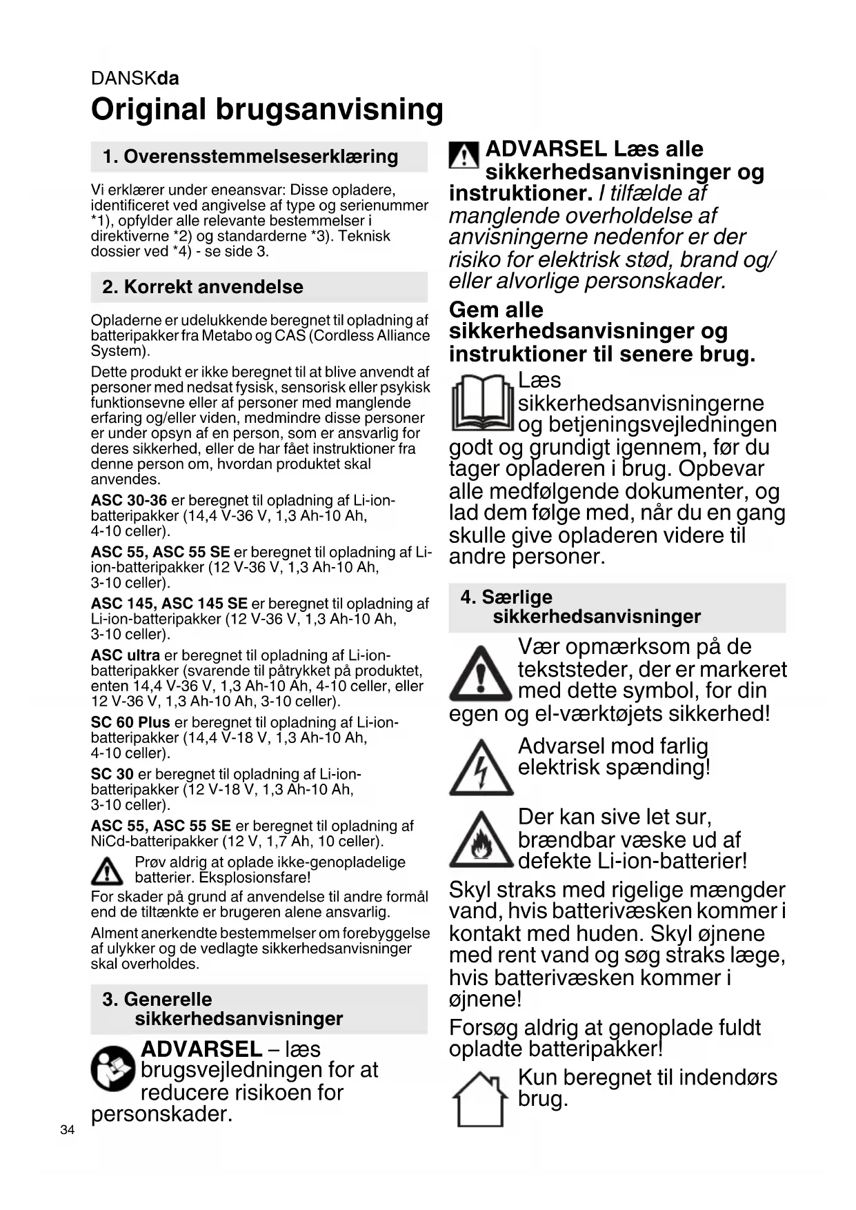 Original brugsanvisning Vi erklærer under eneansvar: Disse opladere, identificeret ved angivelse af type og serienummer *1), opfylder alle relevante bestemmelser i direktiverne *2) og standarderne *3). Teknisk dossier ved *4) - se side 3. Opladerne er udelukkende beregnet til opladning af batteripakker fra Metabo og CAS (Cordless Alliance System). Dette produkt er ikke beregnet til at blive anvendt af personer med nedsat fysisk, sensorisk eller psykisk funktionsevne eller af personer med manglende erfaring og/eller viden, medmindre disse personer er under opsyn af en person, som er ansvarlig for deres sikkerhed, eller de har fået instruktioner fra denne person om, hvordan produktet skal anvendes. ASC 30-36 er beregnet til opladning af Li-ion- batteripakker (14,4 V-36 V, 1,3 Ah-10 Ah, 4-10 celler). ASC 55, ASC 55 SE er beregnet til opladning af Li- ion-batteripakker (12 V-36 V, 1,3 Ah-10 Ah, 3-10 celler). ASC 145, ASC 145 SE er beregnet til opladning af Li-ion-batteripakker (12 V-36 V, 1,3 Ah-10 Ah, 3-10 celler). ASC ultra er beregnet til opladning af Li-ion- batteripakker (svarende til påtrykket på produktet, enten 14,4 V-36 V, 1,3 Ah-10 Ah, 4-10 celler, eller 12 V-36 V, 1,3 Ah-10 Ah, 3-10 celler). SC 60 Plus er beregnet til opladning af Li-ion- batteripakker (14,4 V-18 V, 1,3 Ah-10 Ah, 4-10 celler). SC 30 er beregnet til opladning af Li-ion- batteripakker (12 V-18 V, 1,3 Ah-10 Ah, 3-10 celler). ASC 55, ASC 55 SE er beregnet til opladning af NiCd-batteripakker (12 V, 1,7 Ah, 10 celler). Prøv aldrig at oplade ikke-genopladelige batterier. Eksplosionsfare! For skader på grund af anvendelse til andre formål end de tiltænkte er brugeren alene ansvarlig. Alment anerkendte bestemmelser om forebyggelse af ulykker og de vedlagte sikkerhedsanvisninger skal overholdes. ADVARSEL – læs brugsvejledningen for at reducere risikoen for personskader. ADVARSEL Læs alle sikkerhedsanvisninger og instruktioner. I tilfælde af manglende overholdelse af anvisningerne nedenfor er der risiko for elektrisk stød, brand og/ eller alvorlige personskader. Gem alle sikkerhedsanvisninger og instruktioner til senere brug. Læs sikkerhedsanvisningerne og betjeningsvejledningen godt og grundigt igennem, før du tager opladeren i brug. Opbevar alle medfølgende dokumenter, og lad dem følge med, når du en gang skulle give opladeren videre til andre personer. Vær opmærksom på de tekststeder, der er markeret med dette symbol, for din egen og el-værktøjets sikkerhed! Advarsel mod farlig elektrisk spænding! Der kan sive let sur, brændbar væske ud af defekte Li-ion-batterier! Skyl straks med rigelige mængder vand, hvis batterivæsken kommer i kontakt med huden. Skyl øjnene med rent vand og søg straks læge, hvis batterivæsken kommer i øjnene! Forsøg aldrig at genoplade fuldt opladte batteripakker! Kun beregnet til indendørs brug.
