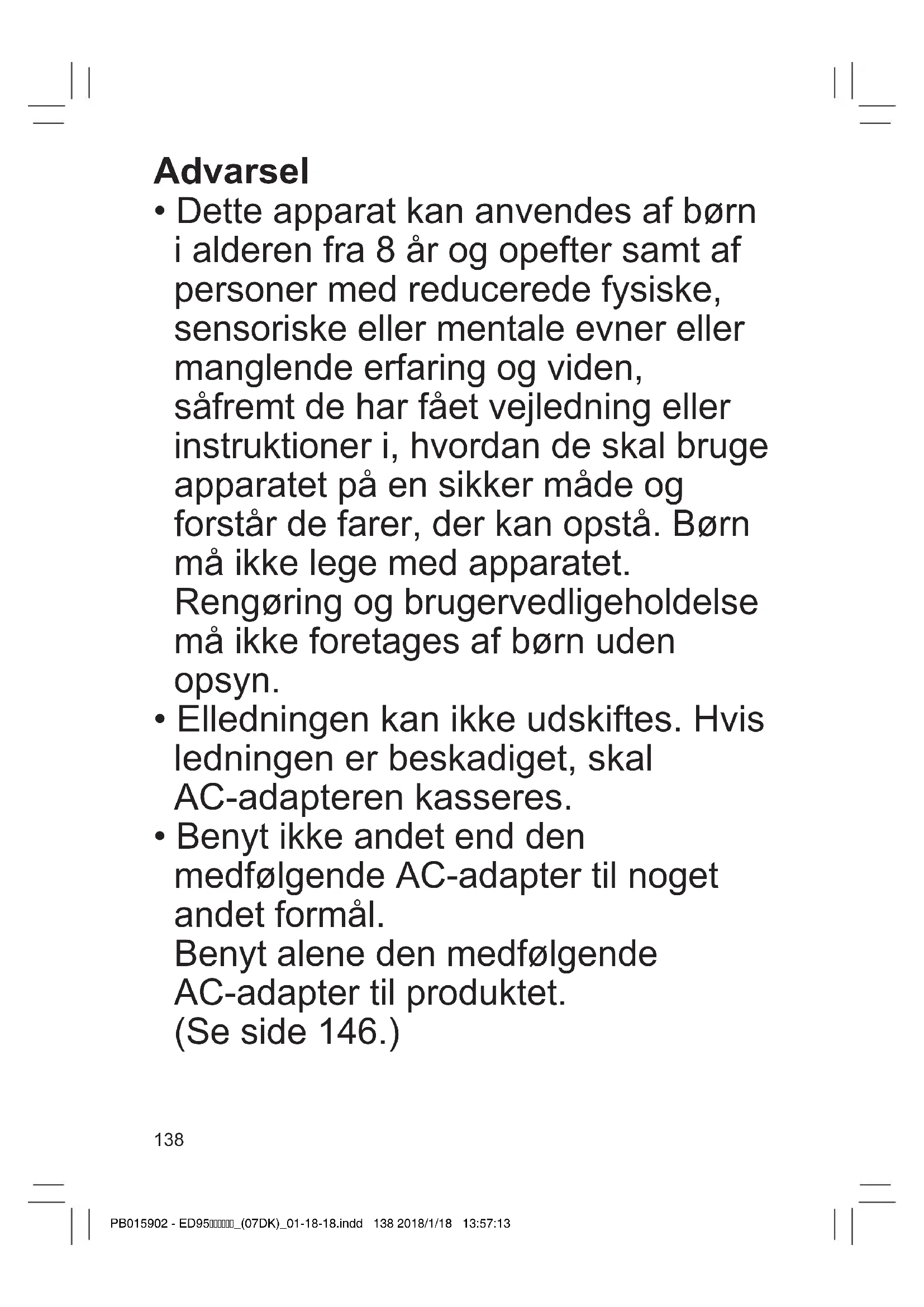 - Benyt ikke andet end den medfølgende AC-adapter til noget andet formål. Benyt alene den medfølgende AC-adapter til produktet. (Se side 146.) PB015902 - ED95_(07DK)_01-18-18.indd 138 2018/1/18 13:57:13139 GBDFINLEDKPNSFINPLCZSKHROTR
