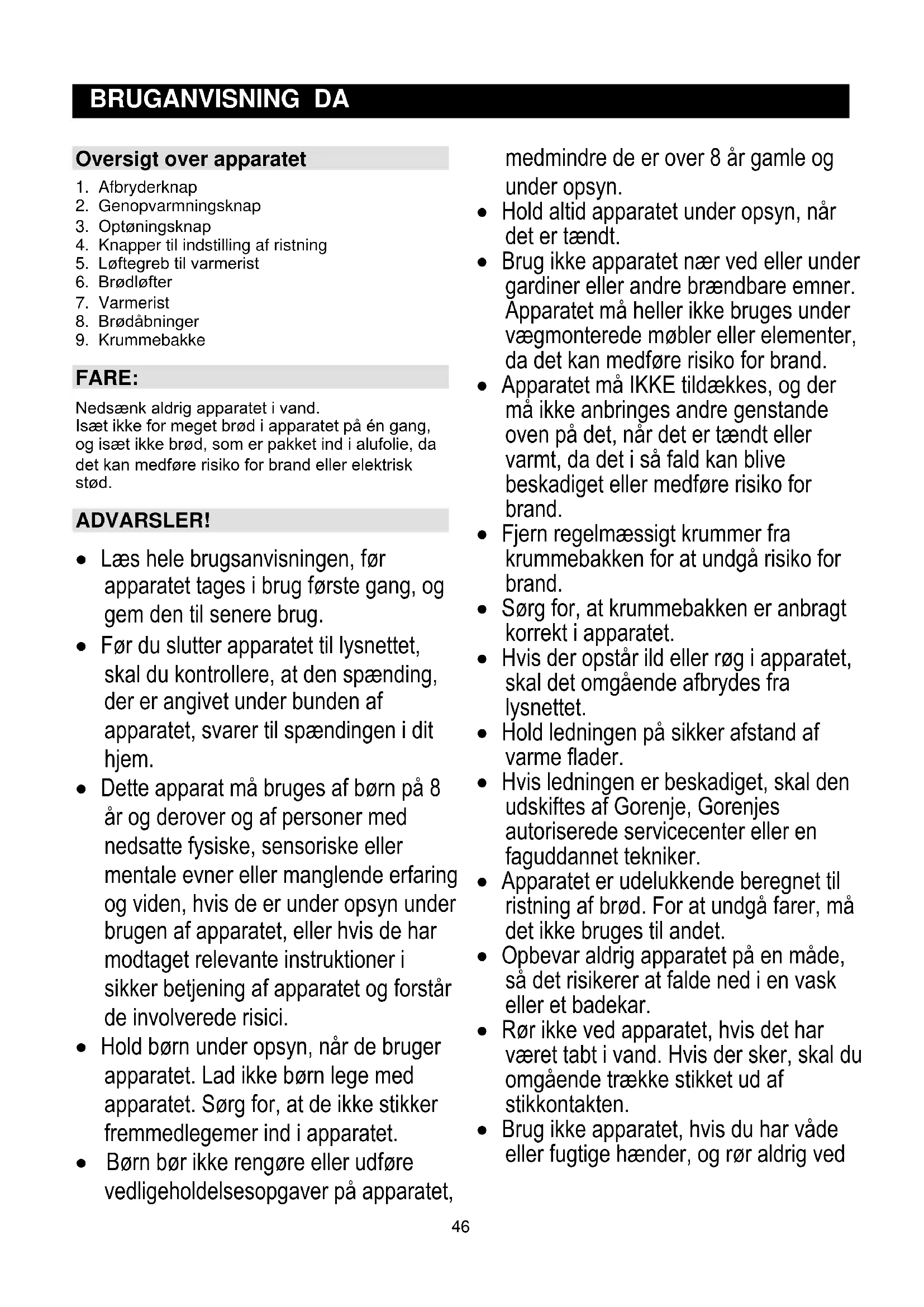 - Apparatet er udelukkende beregnet til ristning af brød. For at undgå farer, må det ikke bruges til andet.